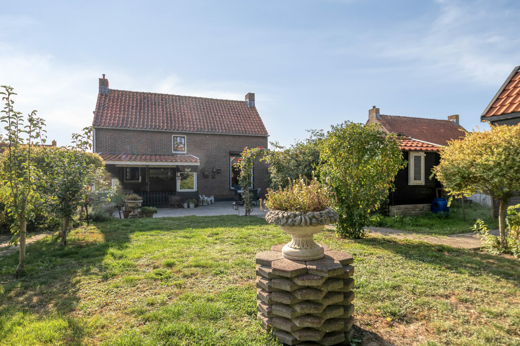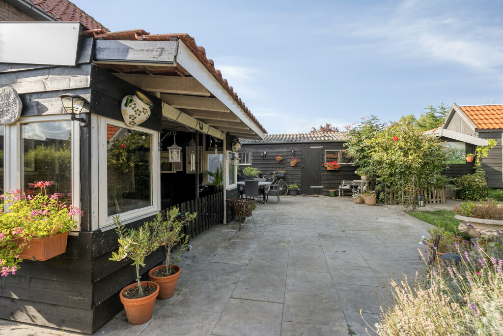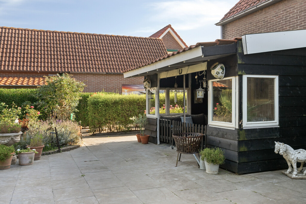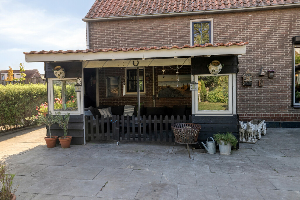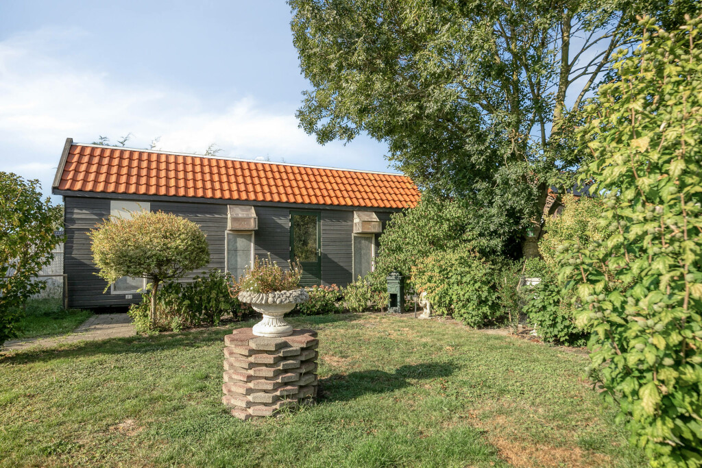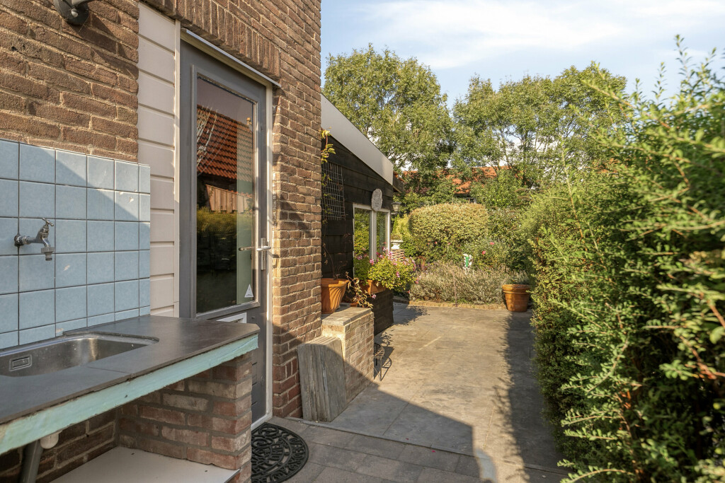 De tuin is een van de grootste troeven van deze woning. Gelegen op het westen geniet je hier volop van de middag- en avondzon. De tuin is fraai aangelegd met een terras, een gazon en kleurrijke borders, en dankzij de vrije achterom is hij ook praktisch in gebruik. Onder de houten overkapping met knusse zithoek kun je het hele jaar door buiten vertoeven. Verder zijn er een aangebouwde garage en een houten berging aanwezig, die samen zorgen voor veel extra opbergruimte en plek voor hobby’s.