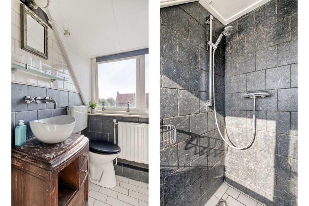 Op de eerste verdieping kom je via de overloop bij twee slaapkamers. De grootste slaapkamer is uitgerust met een airconditioner, zodat het ook tijdens warme zomernachten heerlijk koel blijft. De andere slaapkamer beschikt over vaste kasten in de schotten, ideaal voor het netjes opbergen van kleding en andere spullen. De badkamer is netjes uitgevoerd en beschikt over een douche, toilet en een wastafelmeubel.