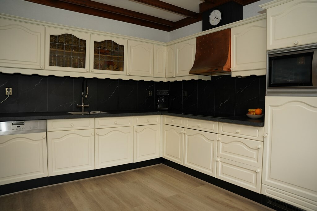 De open keuken is voorzien van alle benodigde apparatuur, inclusief heet water kraan. Het aanrecht blad in de inbouwapparatuur zijn vernieuwd in 2023. Aansluitend vind je de praktische bijkeuken met aansluitingen voor de wasmachine en de droger.