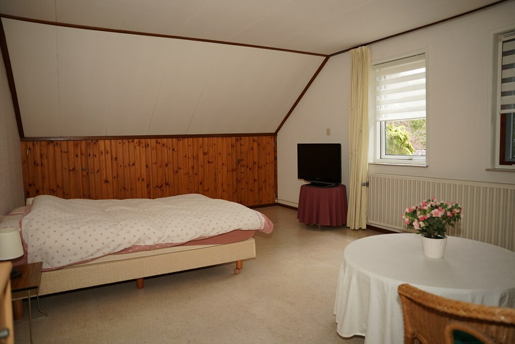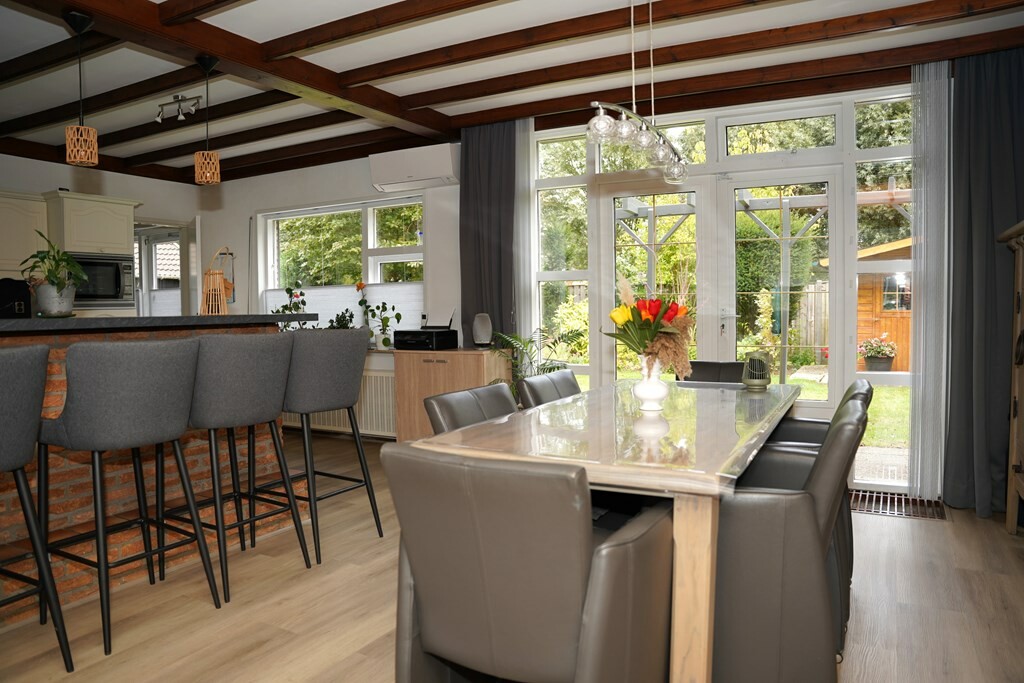 De woonkamer en de keuken zijn voorzien van een moderne pvc vloer, een gezellige houtkachel en openslaande tuindeuren naar het terras. De balken in het plafond zijn decoratief en geven extra karakter aan de ruimte.
