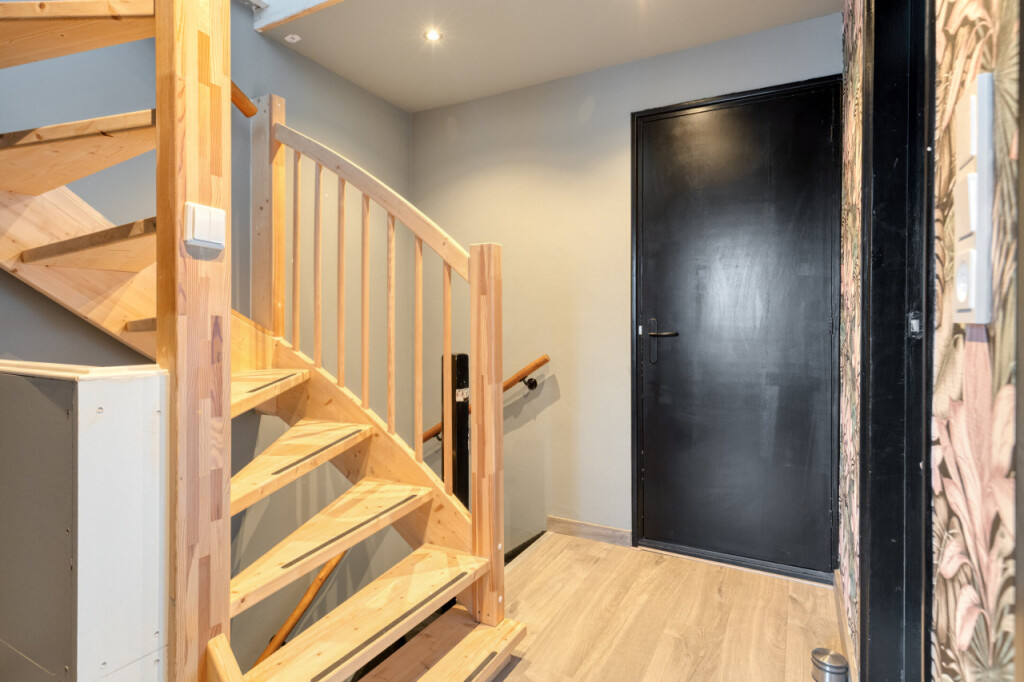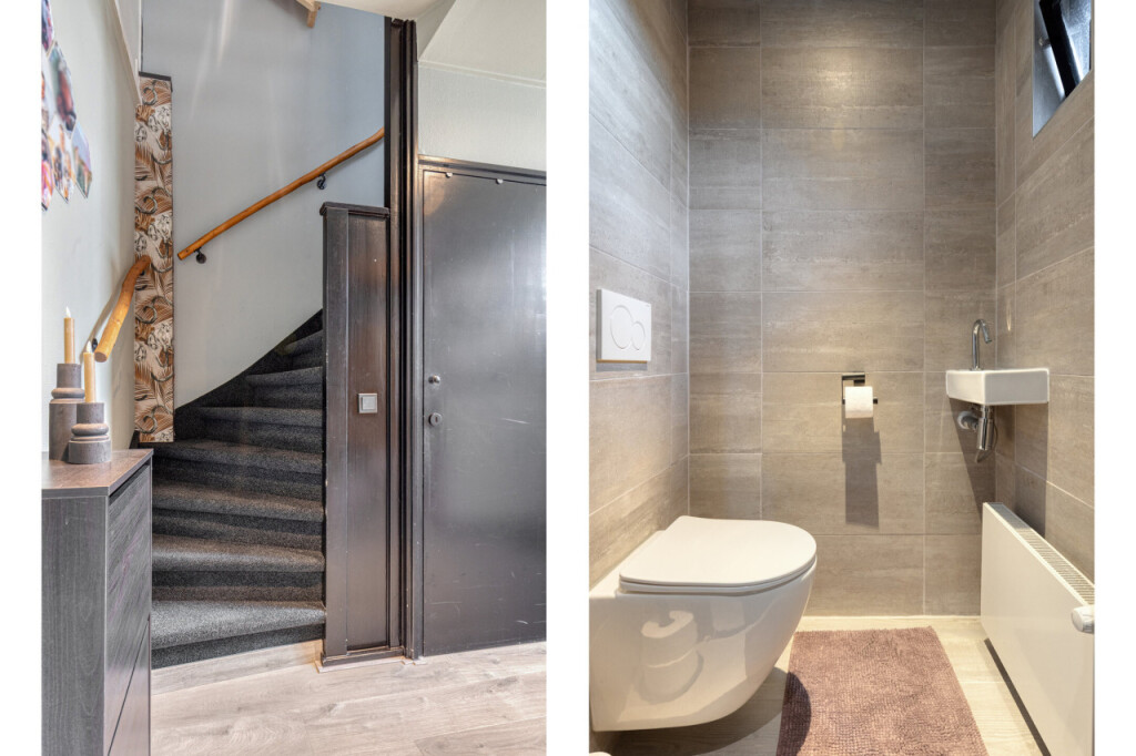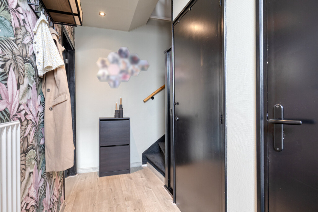 Bij binnenkomst in de hal vind je het toilet met fonteintje, de meterkast met opbergruimte, en de trap naar de eerste verdieping. Vanuit hier is er toegang tot de woonkamer.