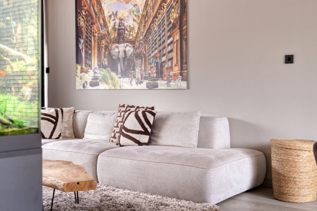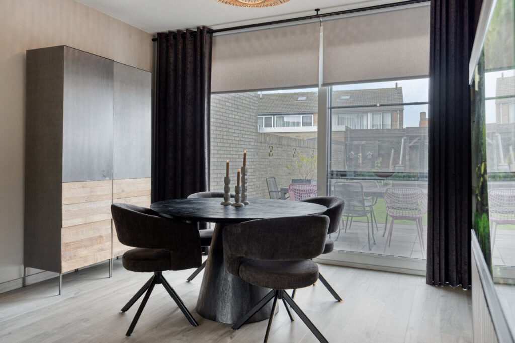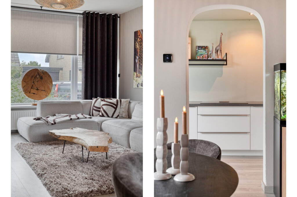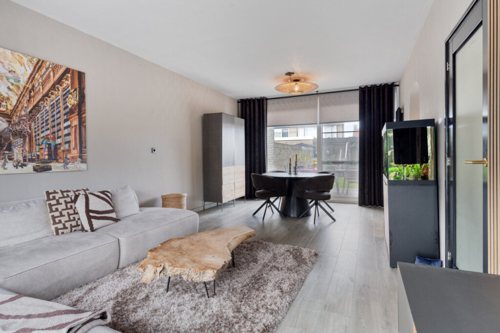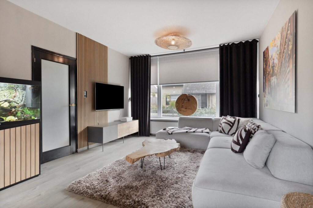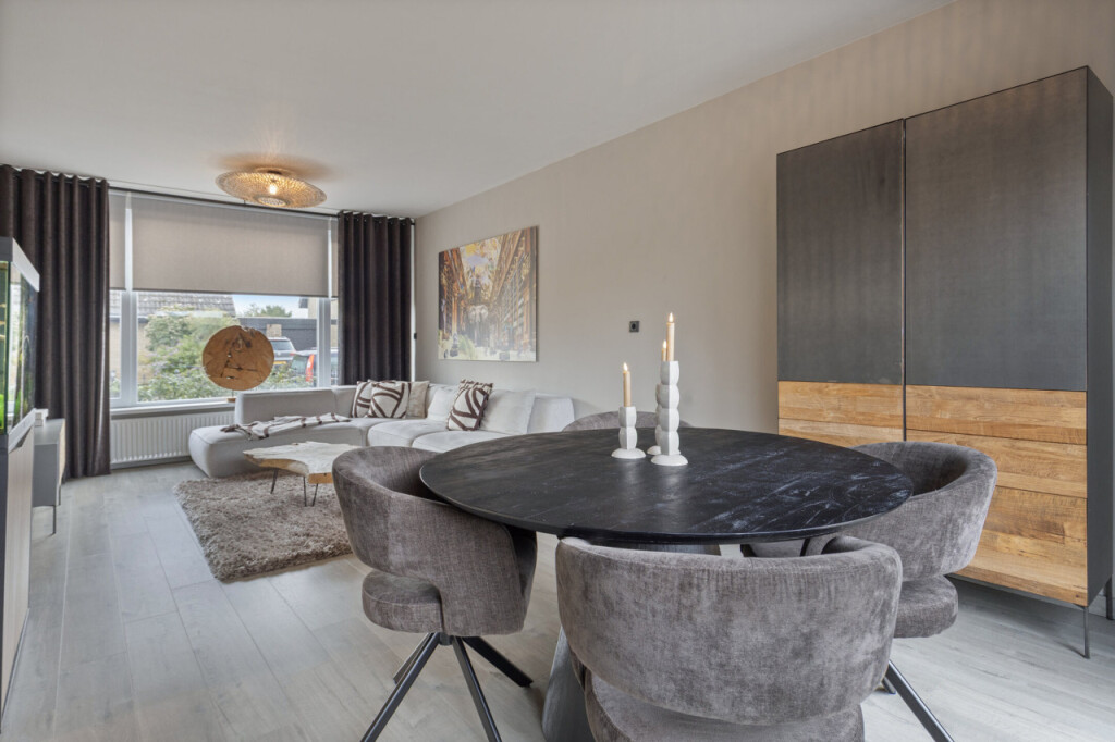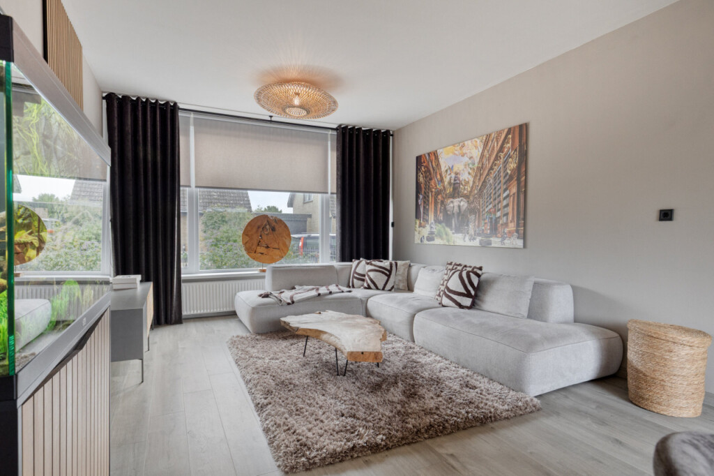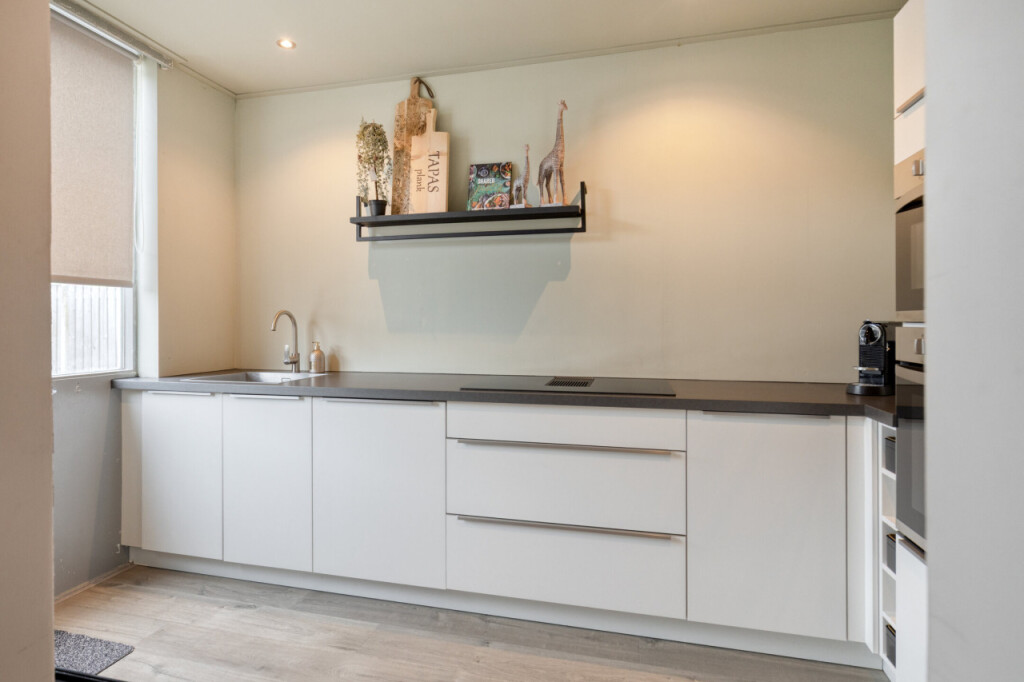 De lichte woonkamer is voorzien van een tijdloze laminaatvloer en geniet van veel daglicht dankzij de schuifpui (gerealiseerd in 2018). De schuifpui is voorzien van een hor, zodat deze in de zomermaanden heerlijk open kan blijven staan. De woonkamer staat in open verbinding met de keuken, wat zorgt voor een prettige en ruime indeling.