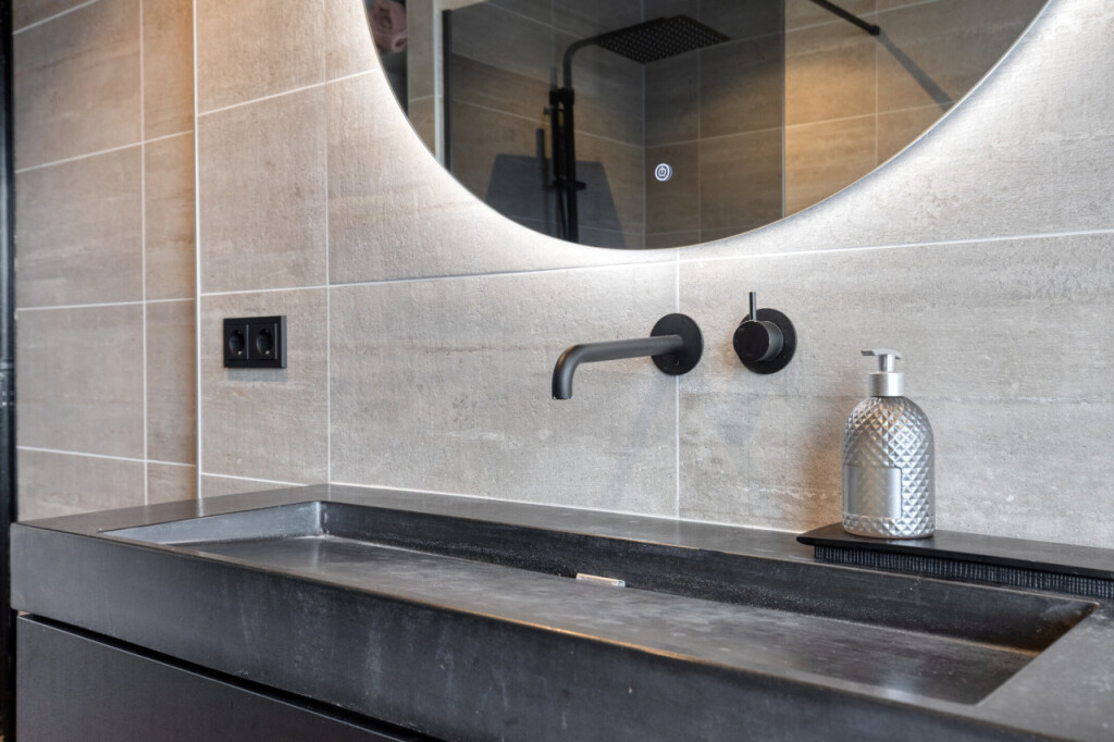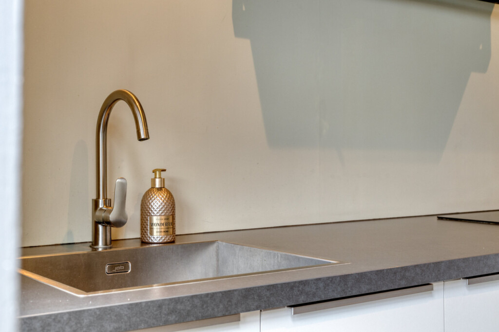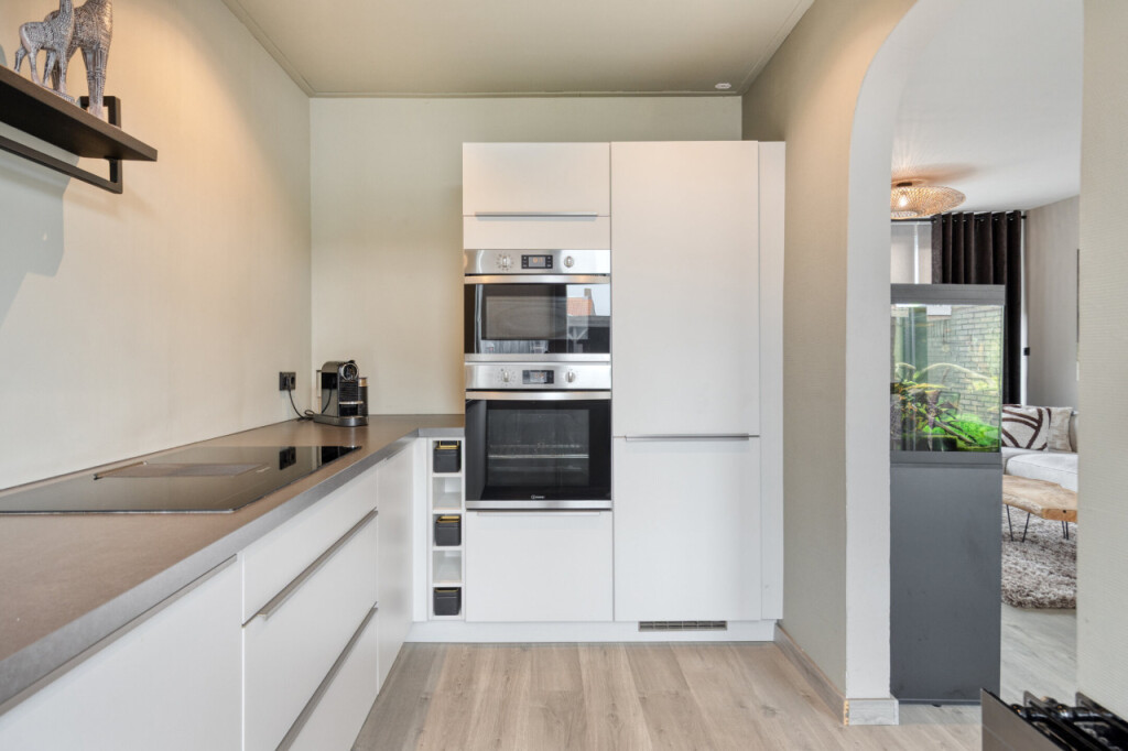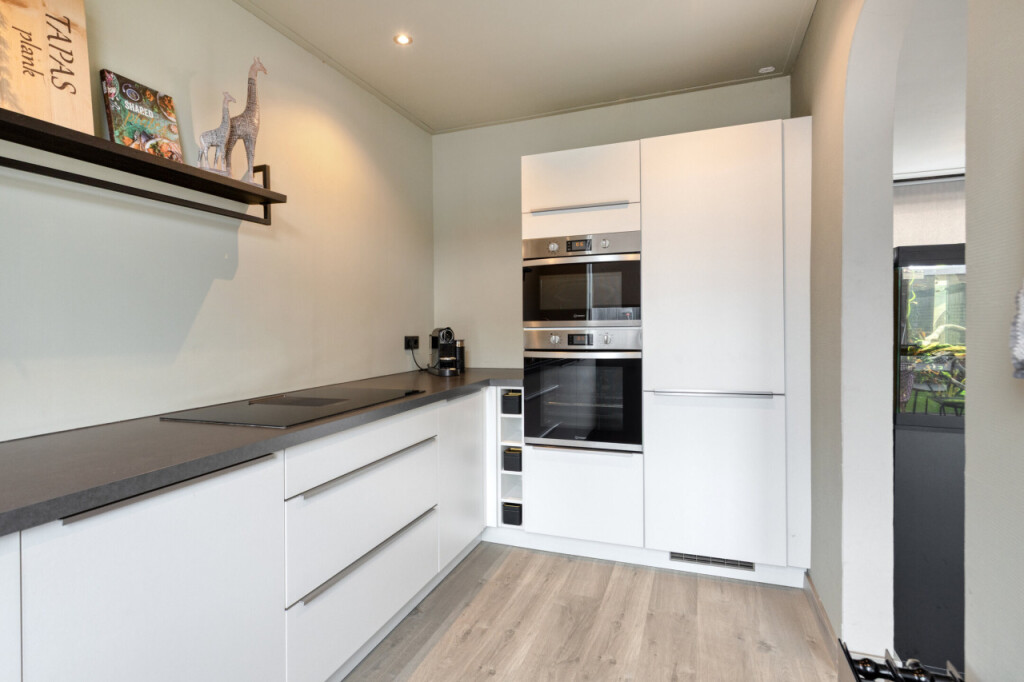De moderne keuken is in 2022 vernieuwd en voorzien van inbouwapparatuur: oven, combi-oven, vaatwasser, koelkast en een inductiekookplaat met geïntegreerde afzuigkap.