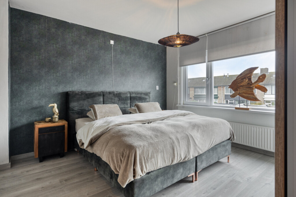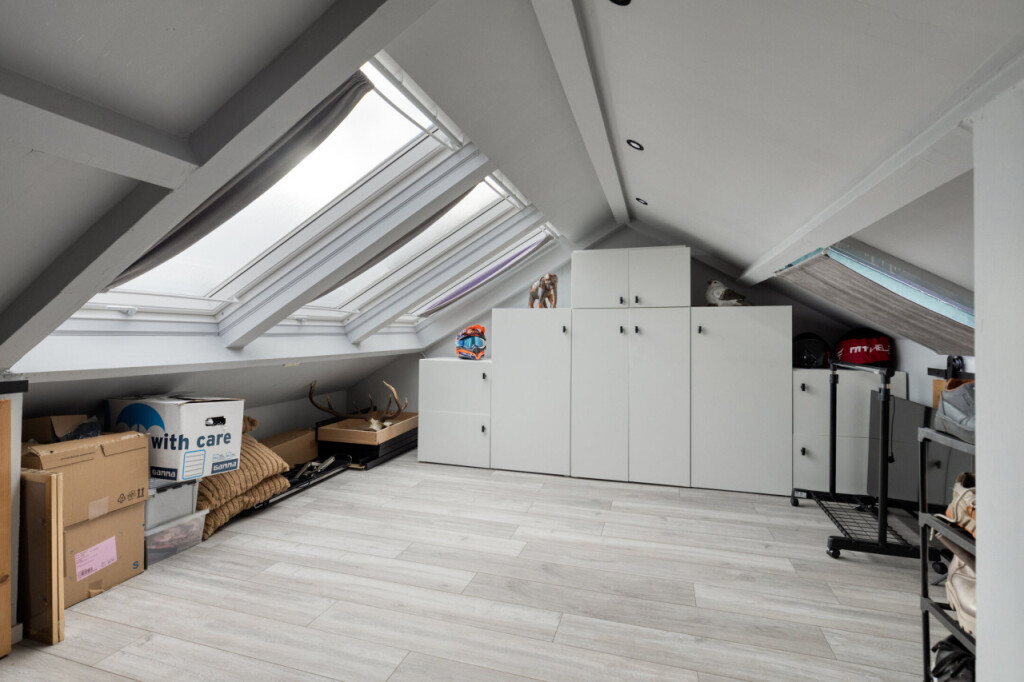 Via een vaste trap is de tweede verdieping bereikbaar. Doordat er drie dakramen zijn geplaatst voorziet deze ruimte van veel daglicht. Deze kamer is te gebruiken als slaapkamer met voldoende opbergruimte.