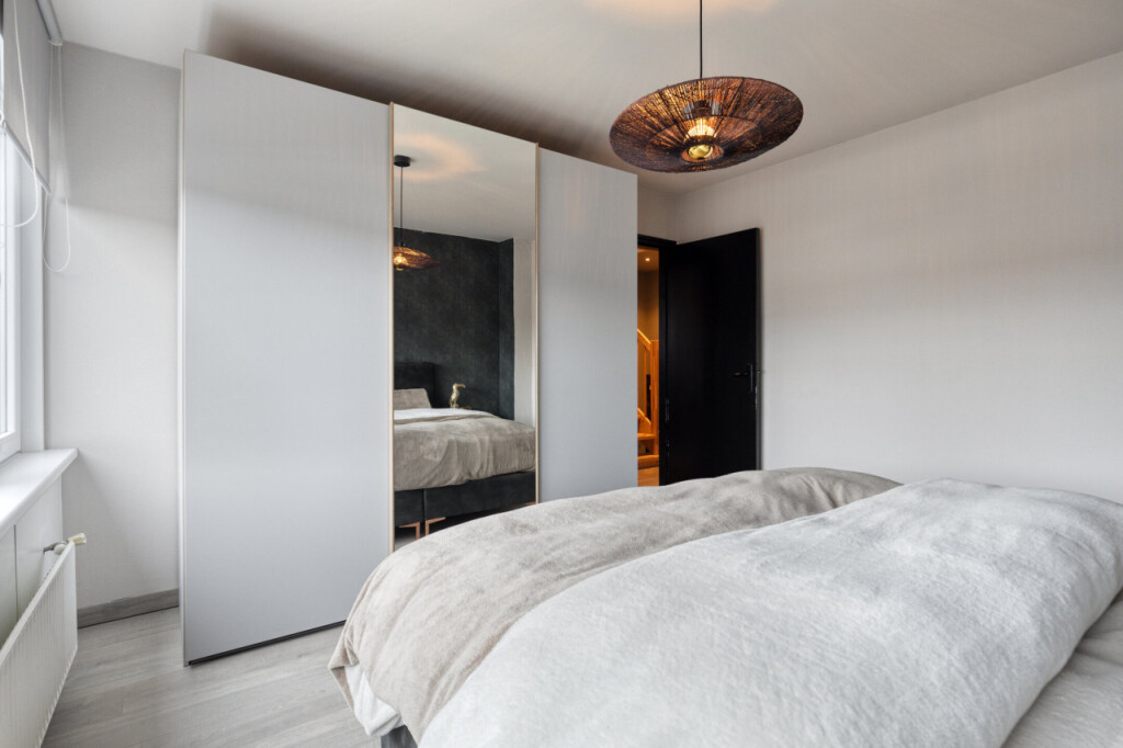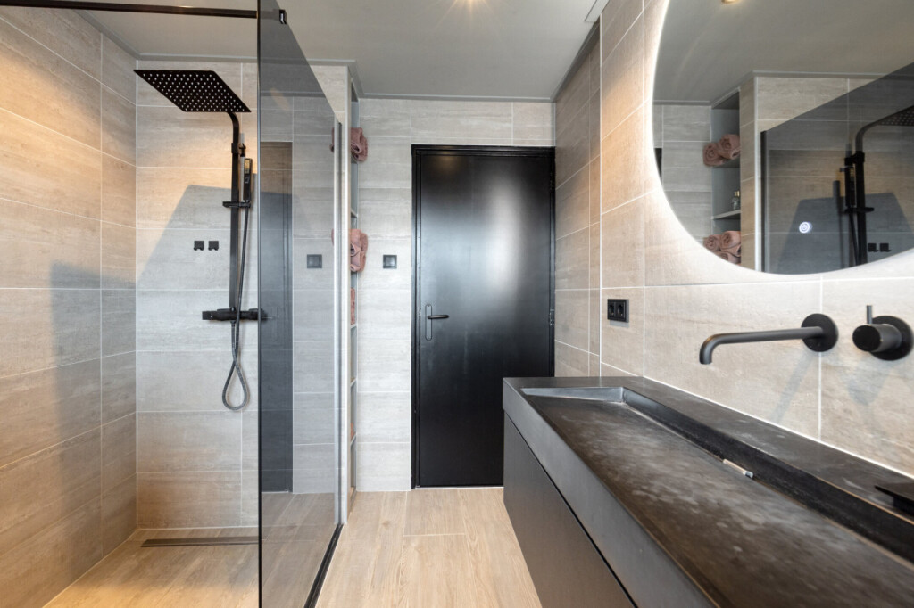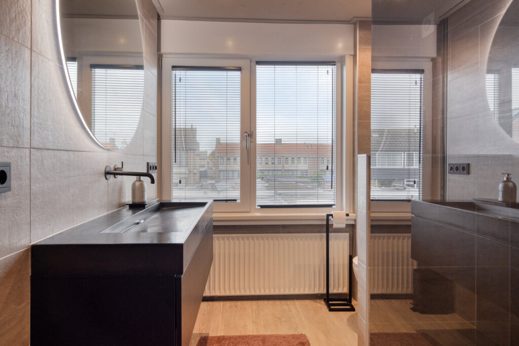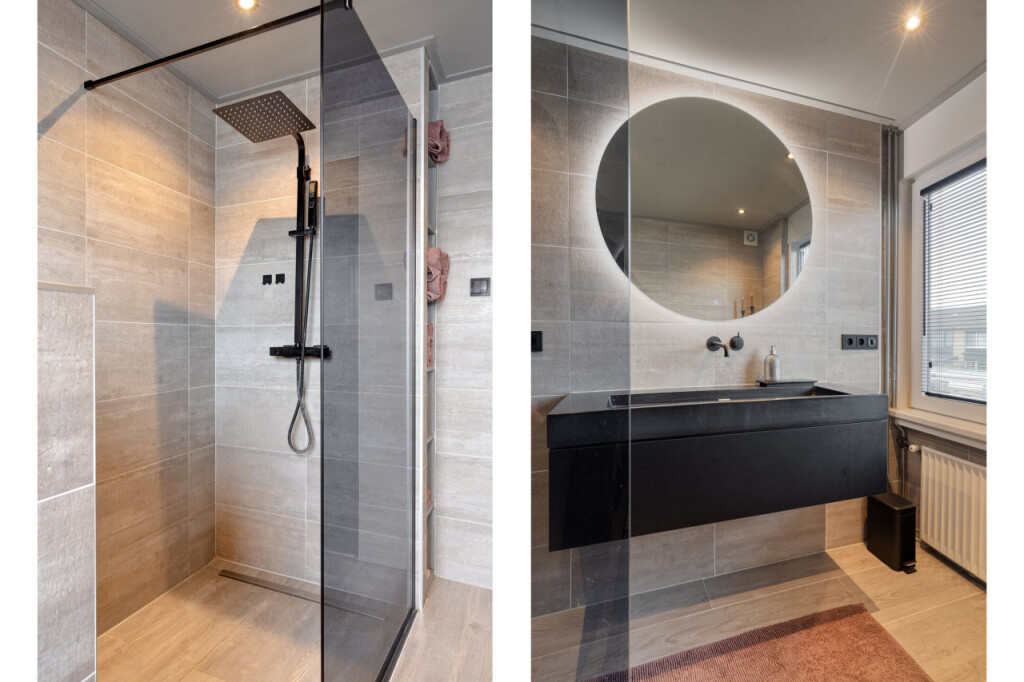 Op de eerste verdieping bevinden zich twee ruime slaapkamers, een wasruimte en een moderne badkamer (2022). De badkamer is ingericht met een inloopdouche, tweede toilet, wastafelmeubel en spiegel.