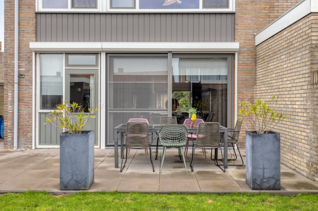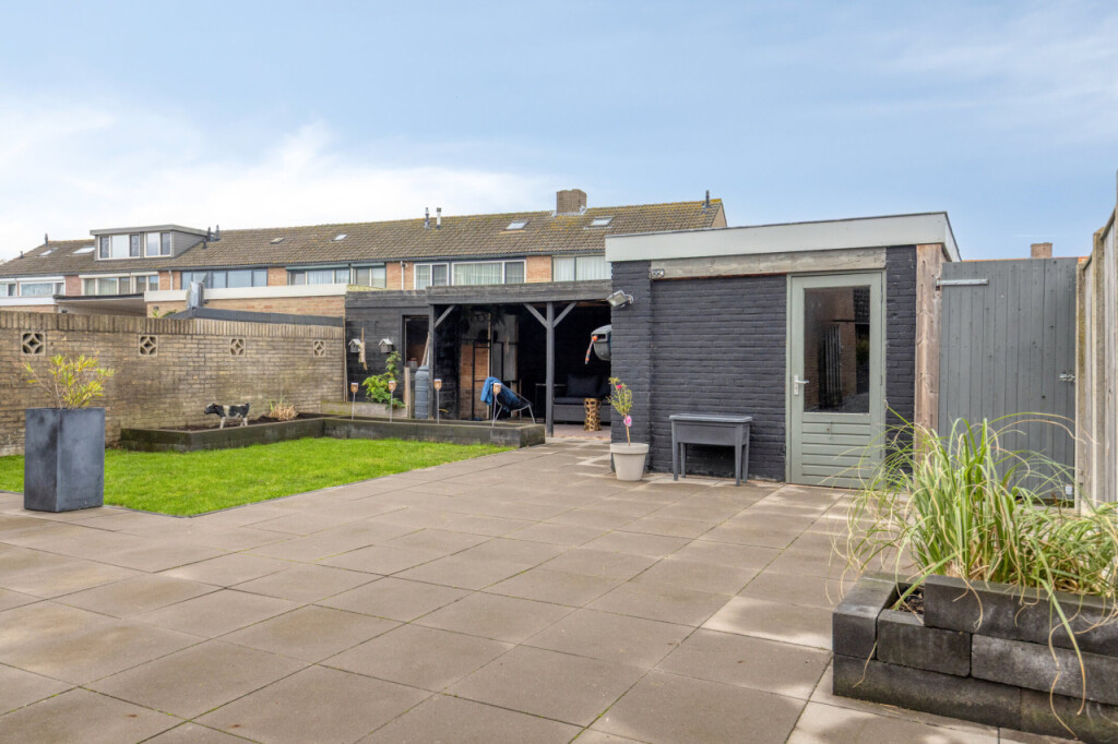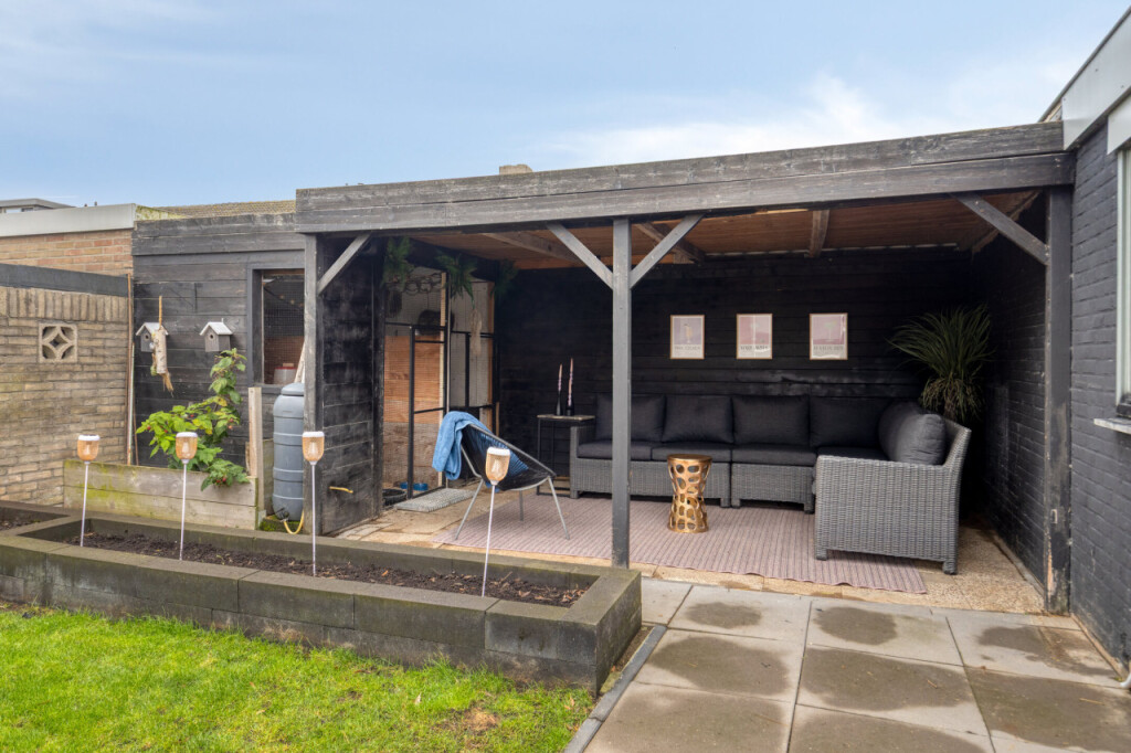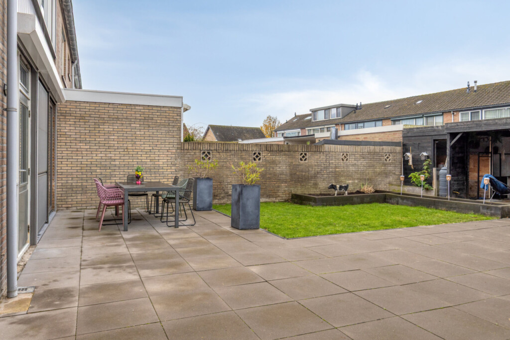 De onderhoudsvriendelijke achtertuin is gelegen op het westen, waardoor er de hele dag genoten kan worden van de zon. Onder de overkapping is het goed toeven, ideaal voor een loungehoek of eettafel. Een klein stukje aan de linkerzijde is ingericht als volière maar kan eenvoudig naar wens worden aangepast zodat je zitgedeelte nog groter wordt.