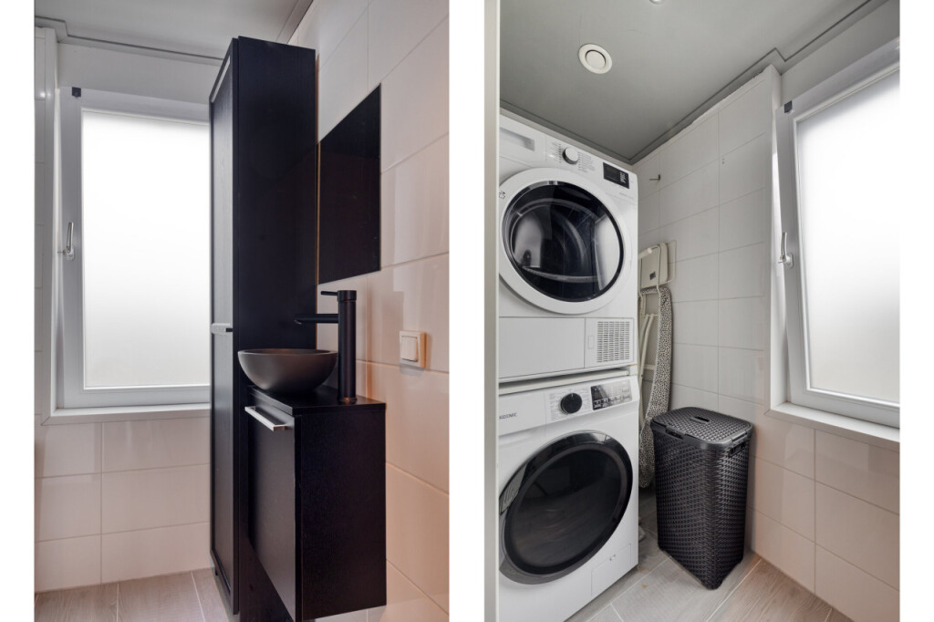 De voormalige badkamer is omgebouwd tot praktische wasruimte, ideaal voor het plaatsen van wasmachine en droger.