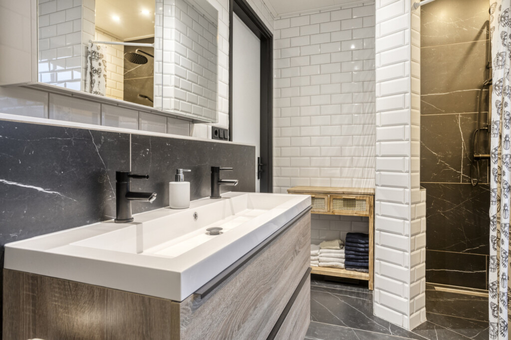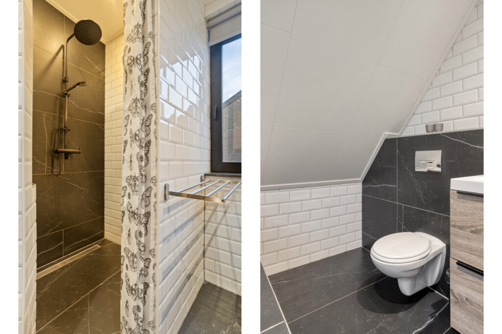 De royale badkamer is compleet uitgevoerd met een ruime inloopdouche, een groot wastafelmeubel met twee kranen en spiegelkast, en een derde toilet. De vloerverwarming maakt ook hier het dagelijks gebruik extra comfortabel.