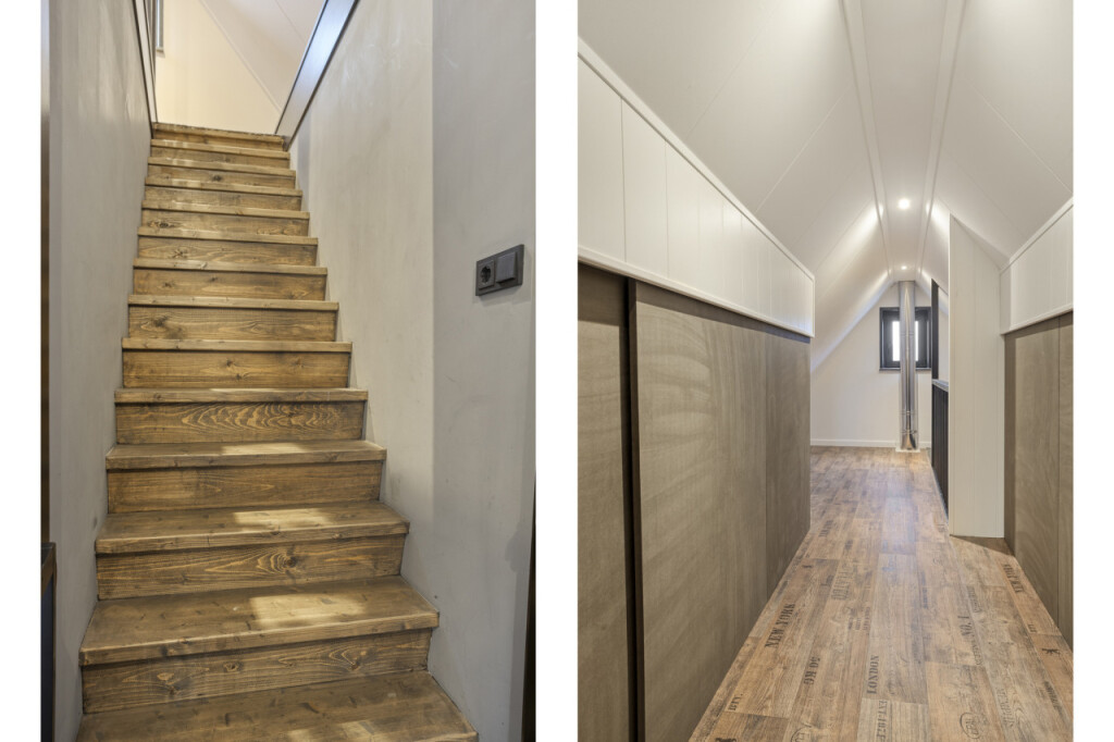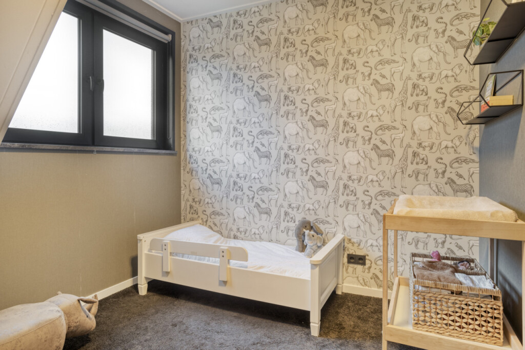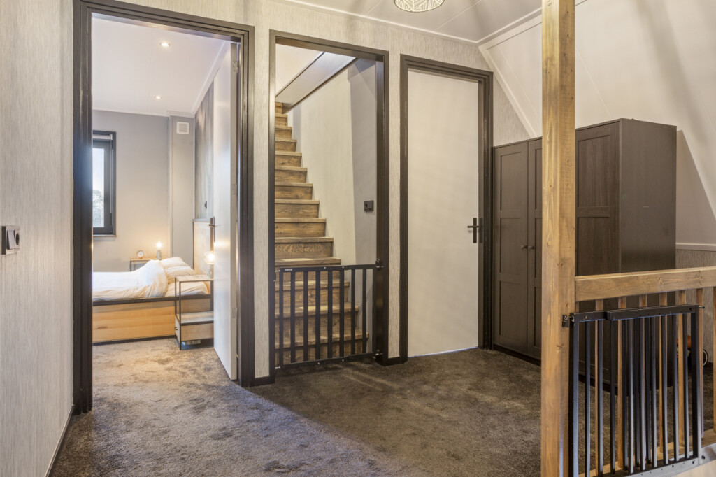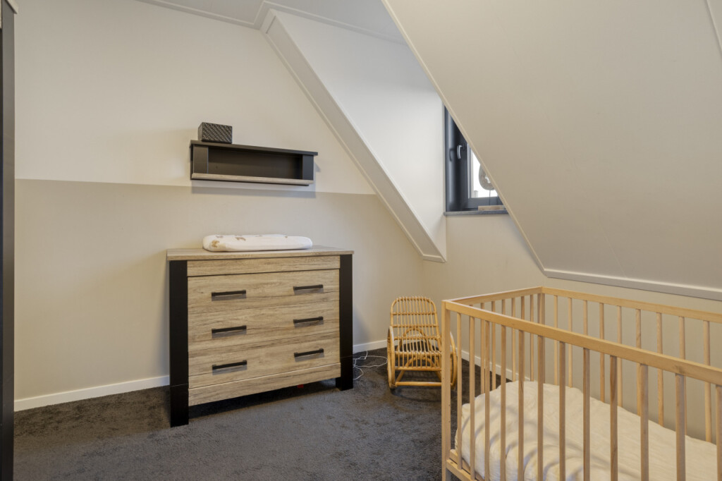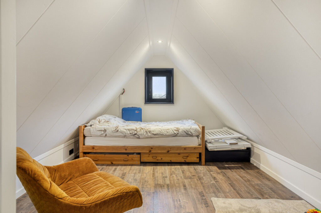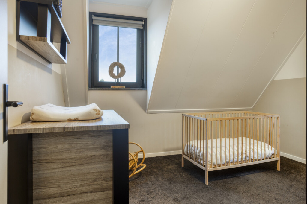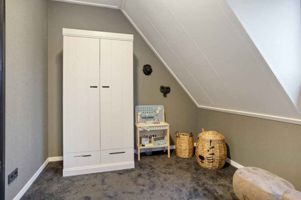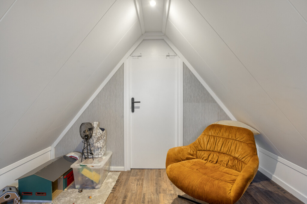 Via een vaste trap bereikt u de tweede verdieping met een overloop en praktische inbouwkasten onder de schuine dakvlakken. De verdieping is afgewerkt met een laminaatvloer, wat zorgt voor een nette en onderhoudsvriendelijke uitstraling. Hier bevindt zich de vijfde slaapkamer, ook uitstekend geschikt als thuiswerkplek of hobbyruimte.