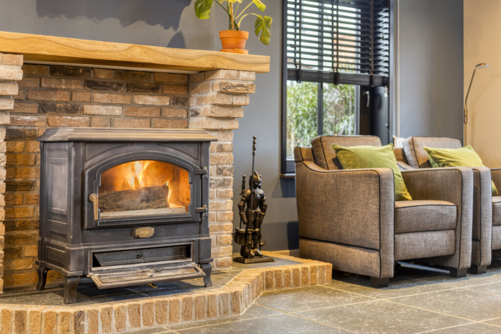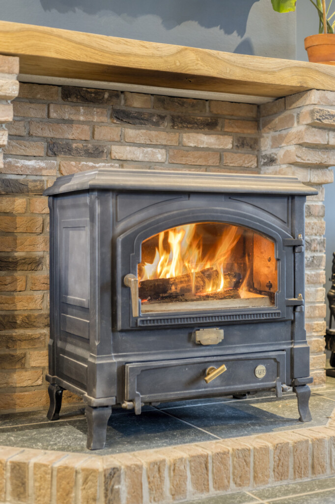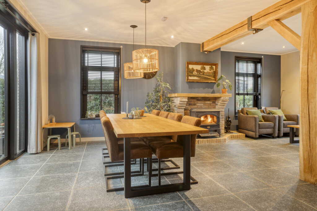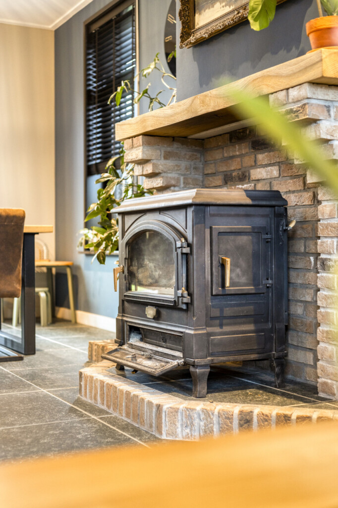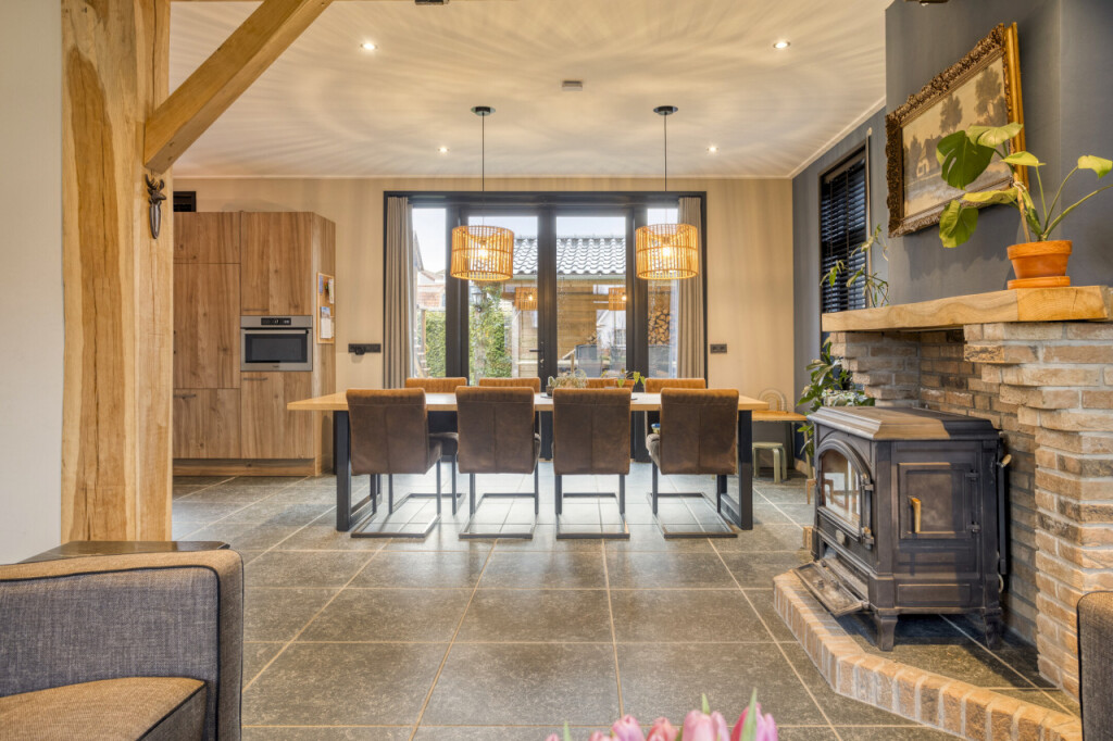 Via de ruime en verzorgde hal met toiletruimte, berging met cv-installatie en trapopgang bereikt u de leefruimtes. De gehele begane grond is voorzien van vloerverwarming, wat zorgt voor een aangename, gelijkmatige warmte en extra wooncomfort. De lichte en royale woonkamer vormt het warme middelpunt van de woning en is voorzien van een tegelvloer en een sfeervolle houtkachel. De openslaande tuindeuren zorgen voor een directe verbinding met de tuin en laten veel daglicht binnen.