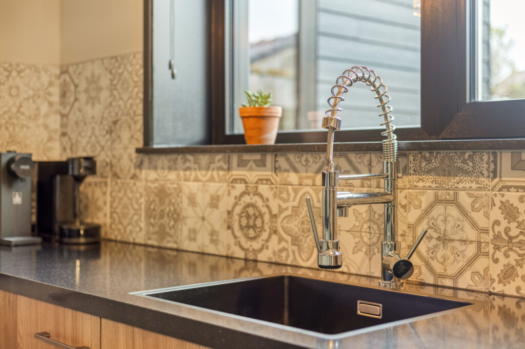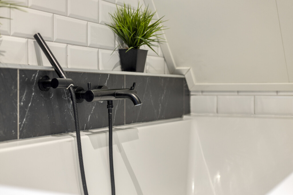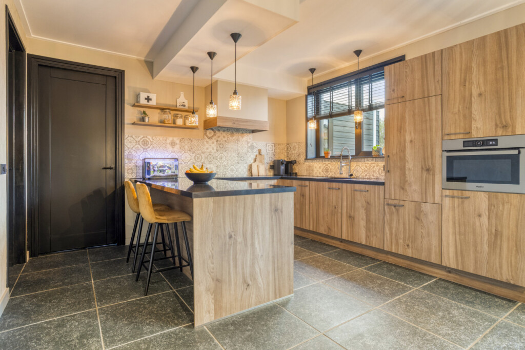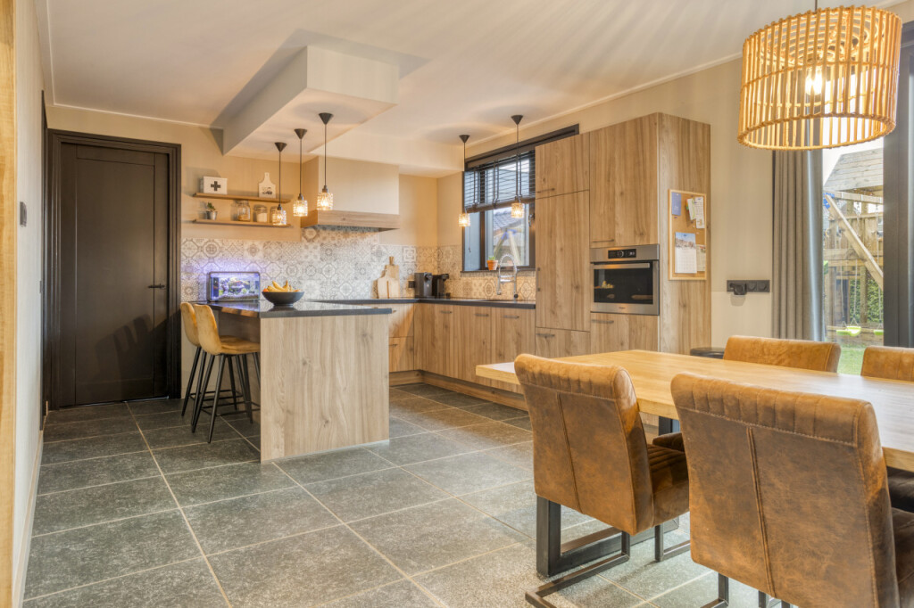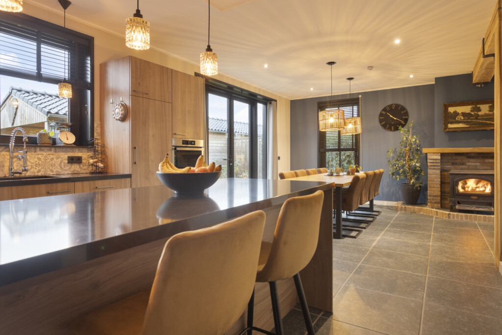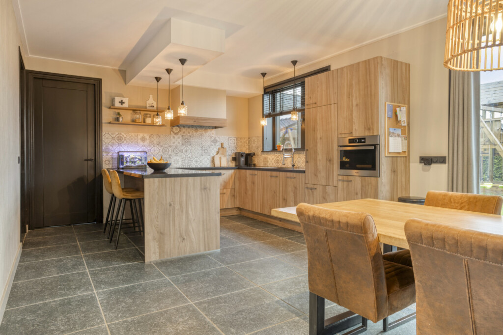 De luxe open keuken sluit hier naadloos op aan en is uitgerust met een composiet werkblad, een 4-pits inductiekookplaat, een combimagnetron en een vaatwasser – ideaal voor zowel dagelijks gebruik als gezellig samenzijn.