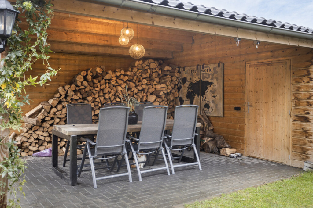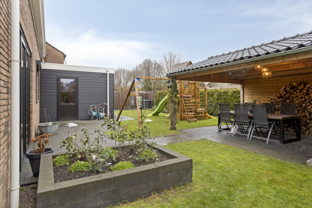 De verzorgde tuin is gelegen op het zuidoosten, waardoor u al vroeg op de dag van de zon kunt genieten. Achterin de tuin staat een houten tuinhuis (4,6 x 2,4 m) met een sfeervolle overkapping (4,8 x 4,3 m) – een fijne plek om beschut buiten te zitten.