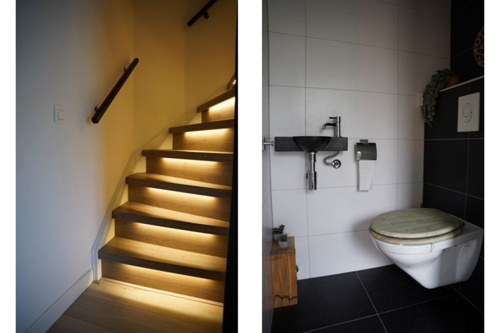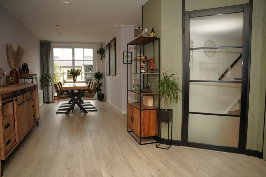 Je komt binnen in de hal met een modern hangtoilet en stijlvolle zwarte deuren met glas, die direct zorgen voor een eigentijdse uitstraling.