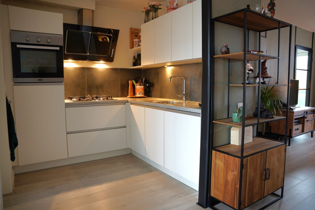 De open keuken (vernieuwd in 2017) is uitgerust met diverse inbouwapparatuur en biedt voldoende werk- en bergruimte.