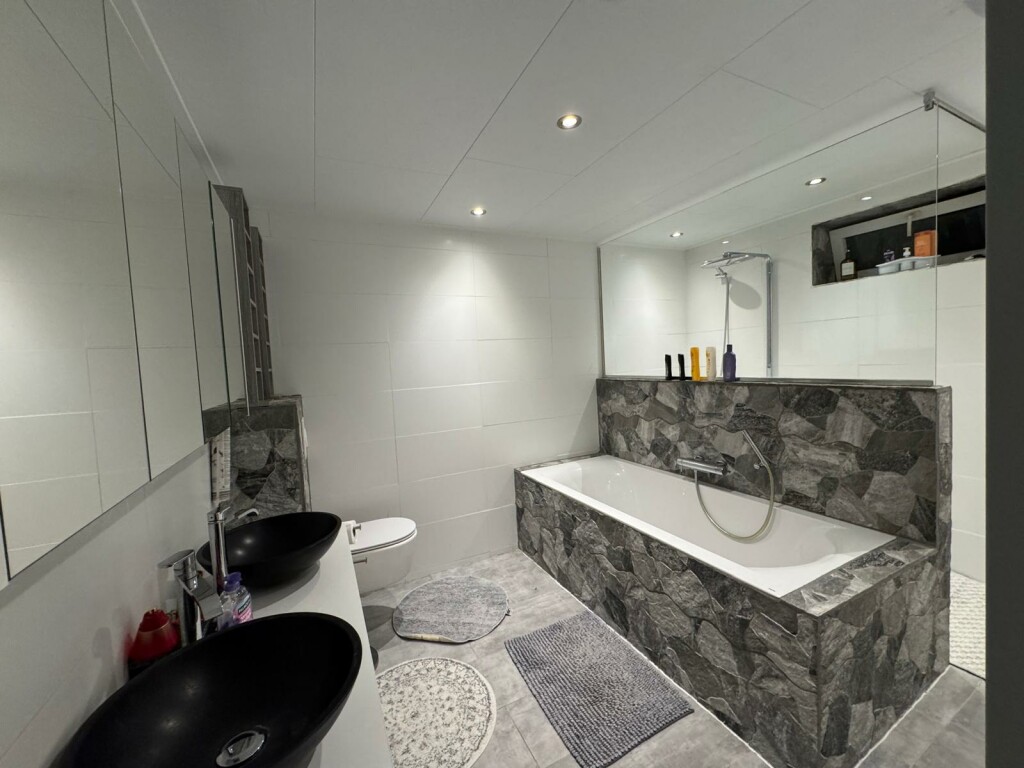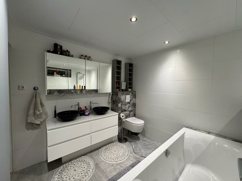 - Ruime badkamer met ligbad, inloopdouche, dubbele wastafel met meubel en toilet (2020).