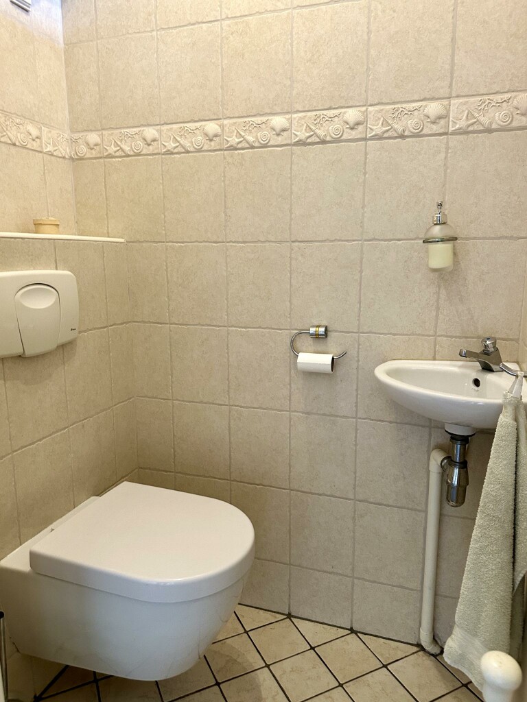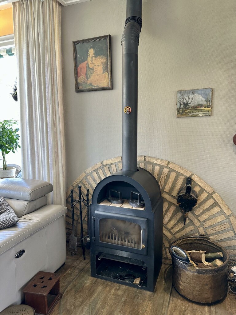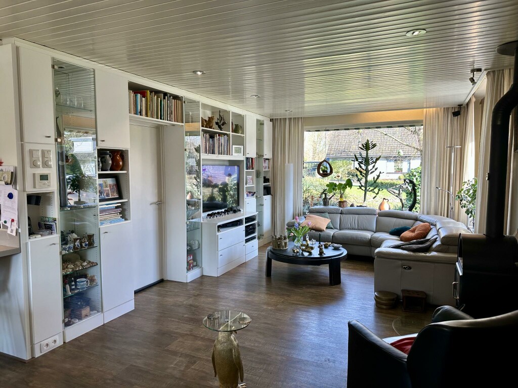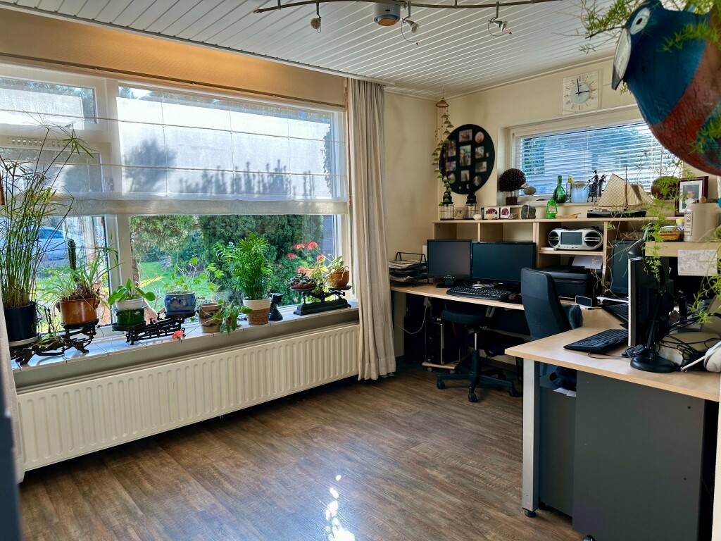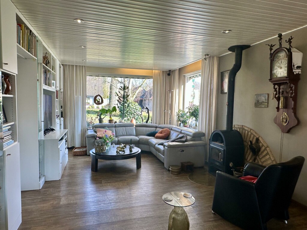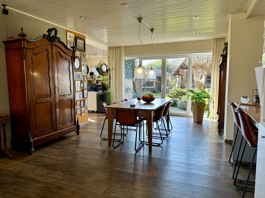 Ruime hal met moderne toiletruimte (2020) en trap naar de eerste verdieping. De lichte en royale woonkamer is voorzien van een PVC-vloer (2020), een sfeervolle houtkachel en openslaande deuren naar de zonnige achtertuin. Een gedeelte van de woonkamer wordt momenteel gebruikt als kantoor, maar kan eenvoudig worden ingericht als tv-hoek of speelhoek voor de kinderen.