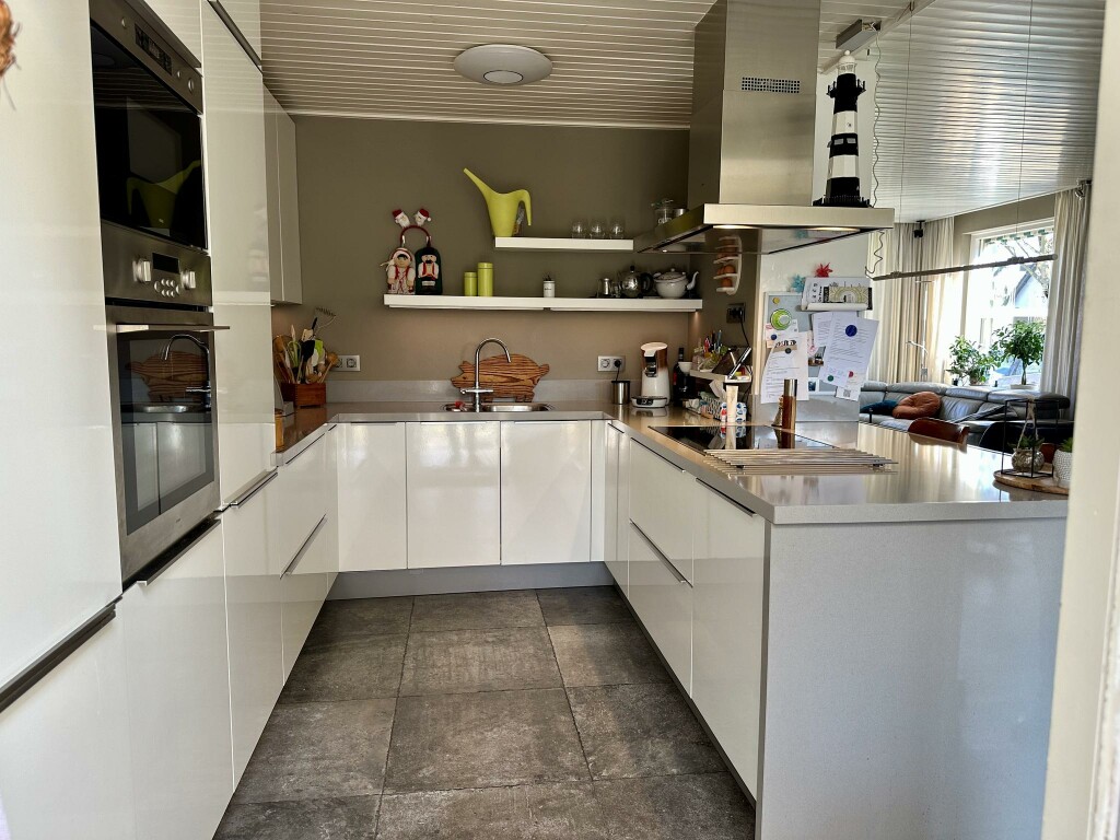 De luxe open keuken (2018) heeft een praktische U-opstelling met een composiet werkblad en een eet-/bar gedeelte. De keuken is volledig uitgerust met hoogwaardige inbouwapparatuur, waaronder een kokend waterkraan (Francke), een 4-pits inductiekookplaat (Miele), een grote koelkast (Bauknecht), een magnetron en oven met draaispit (beide ATAG) en een vaatwasser (Miele). Aangrenzend bevindt zich een handige berging met aansluiting voor de wasmachine.
