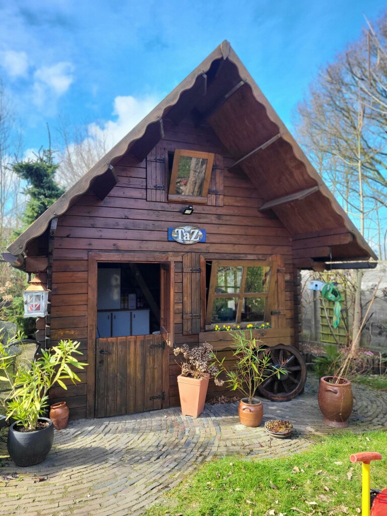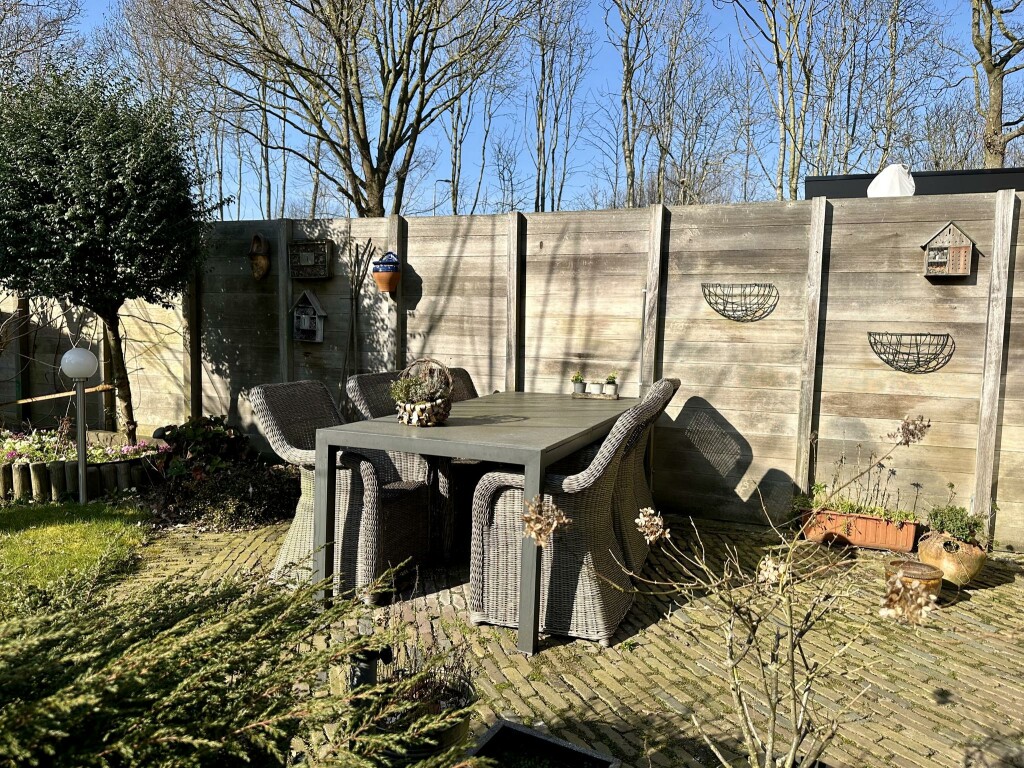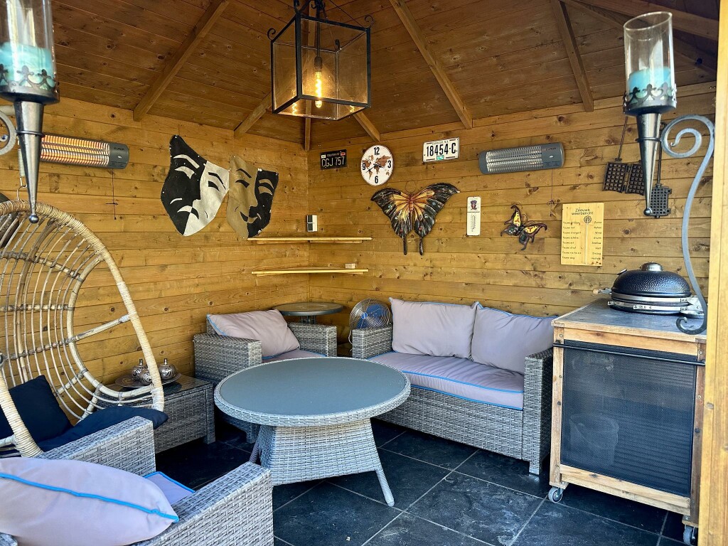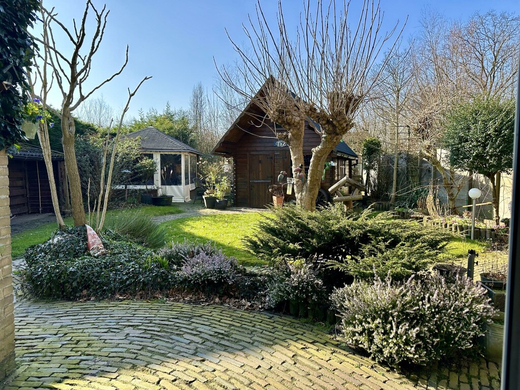 De zonnige achtertuin biedt veel privacy en is voorzien van een vrijstaand houten tuinhuis (3,8 x 3,1 m) met zolder en elektra. Daarnaast is er een sfeervol prieel (3,3 x 3,3 m) met elektrische verwarming, perfect om het hele jaar door van de tuin te genieten.