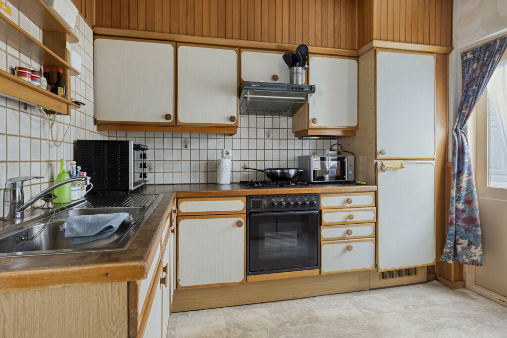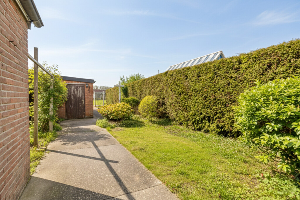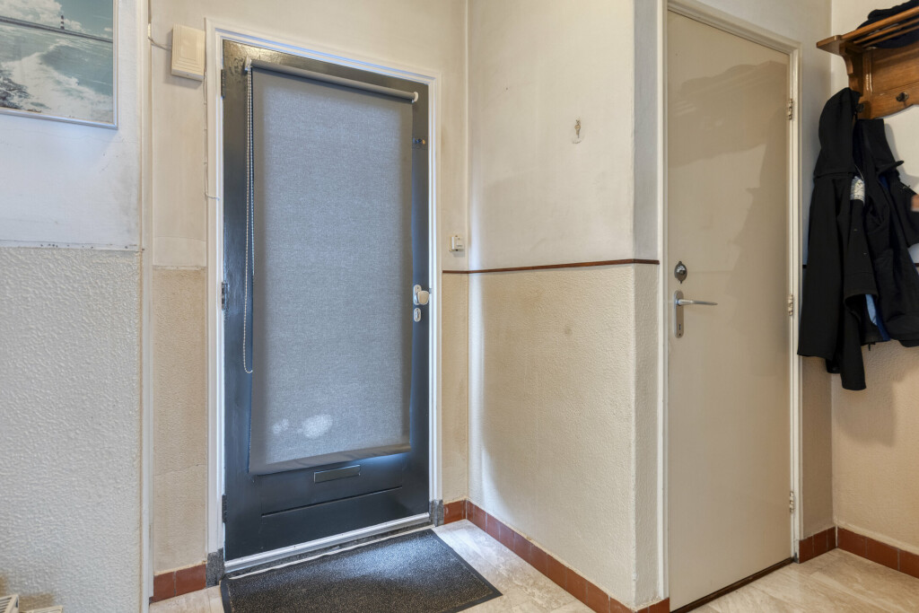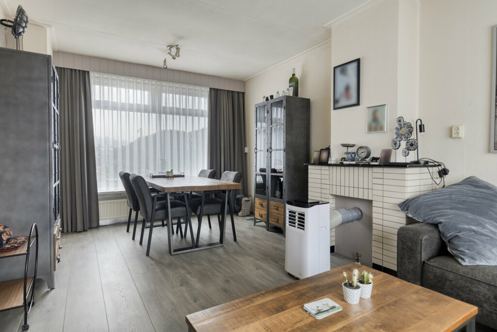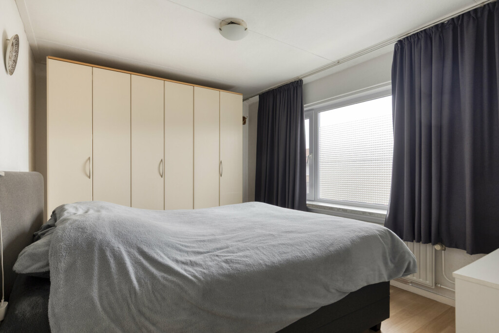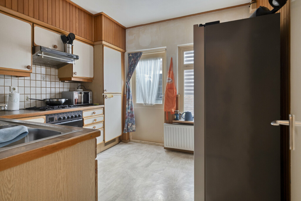 Bij binnenkomst via de hal (met toilet) valt direct de lichte en ruime woonkamer op. De grote raampartijen zorgen voor een prettige lichtinval en de praktische vaste kast biedt extra bergruimte. De gesloten keuken is van alle gemakken voorzien: een 4-pits gaskookplaat, afzuigkap, oven en koelkast. Aansluitend vindt u de ruime bijkeuken met witgoedaansluitingen en directe toegang tot de achtertuin.