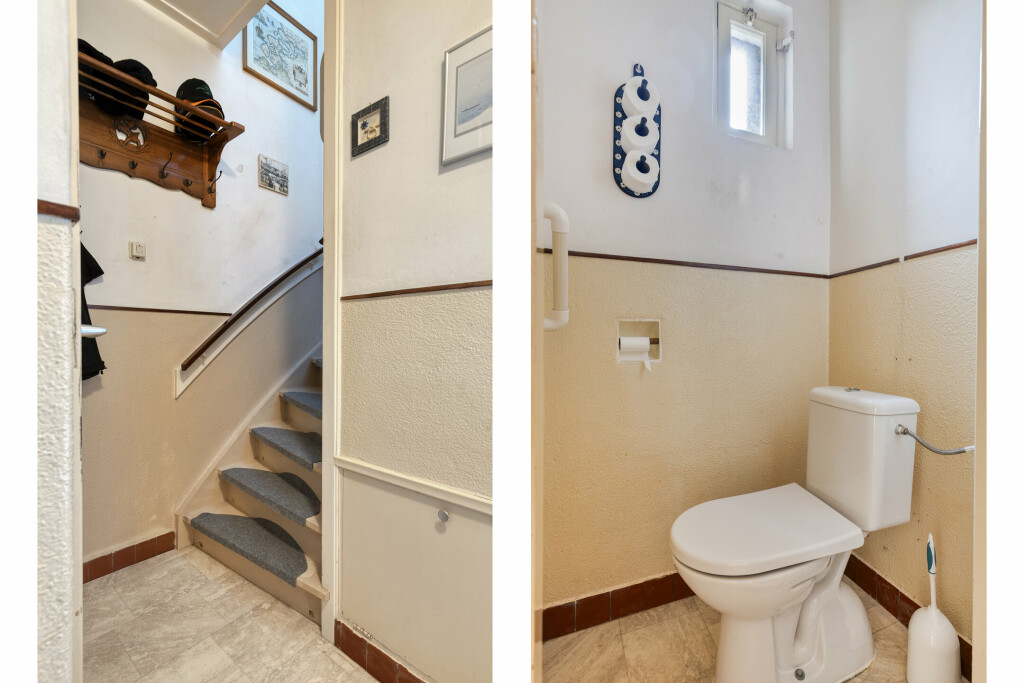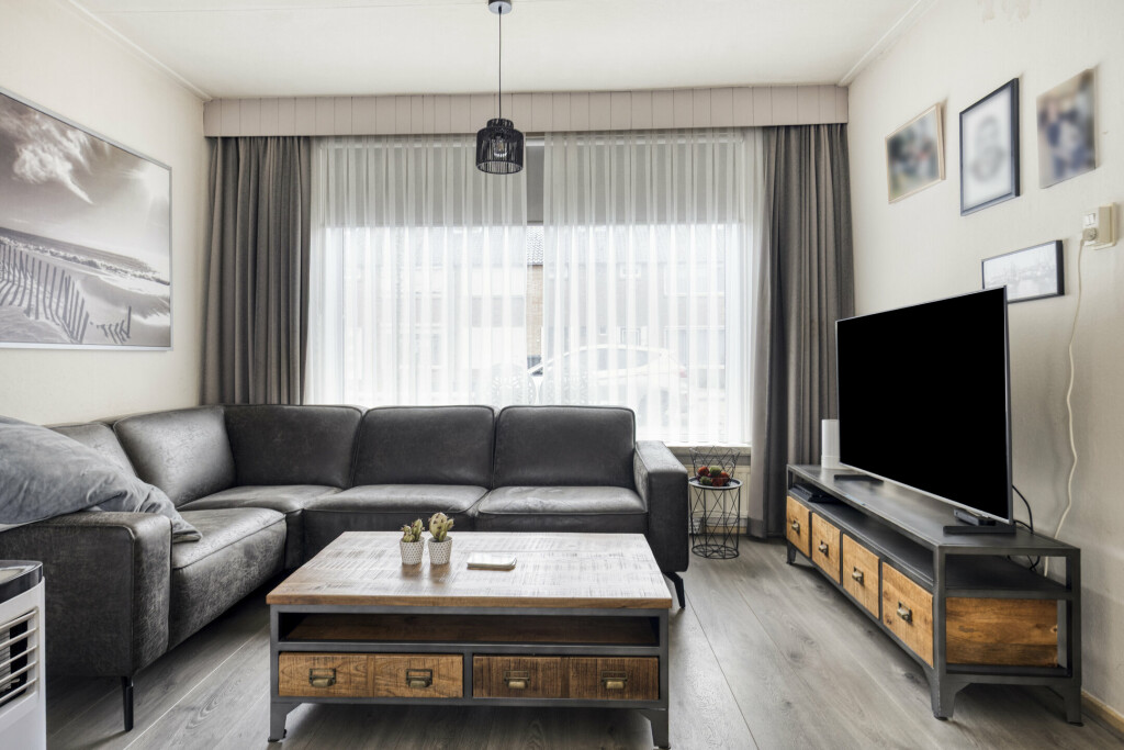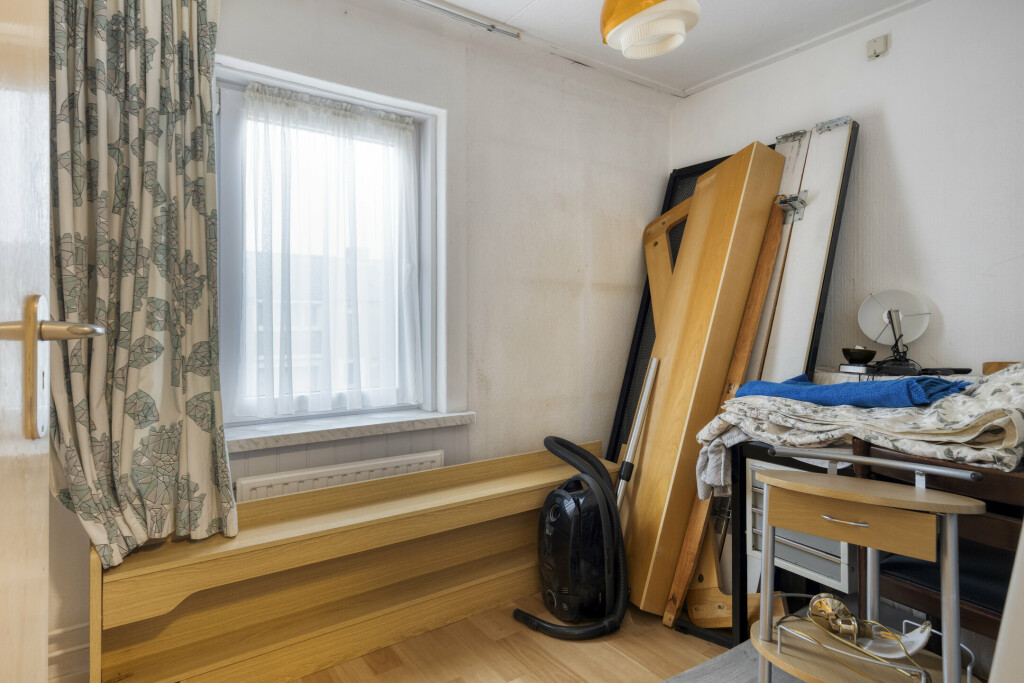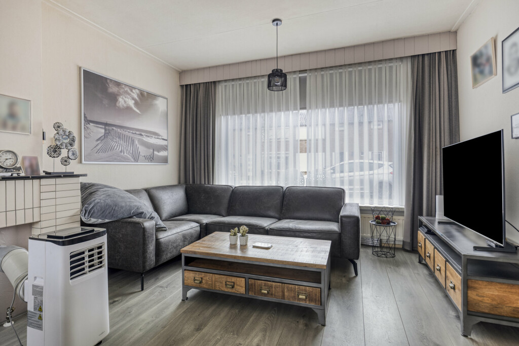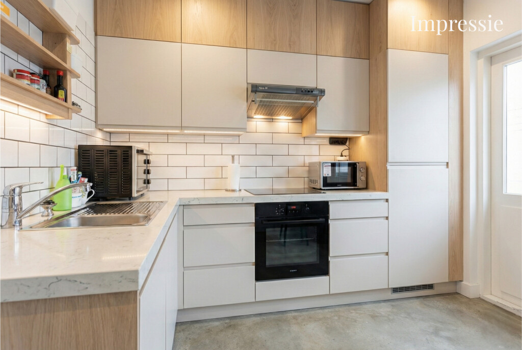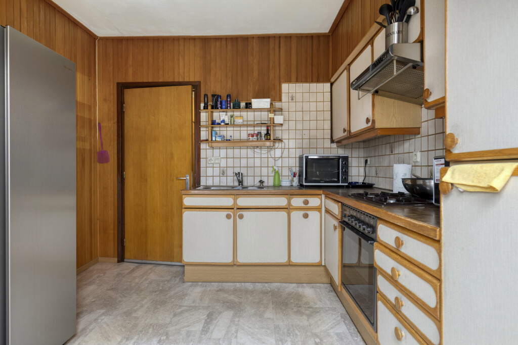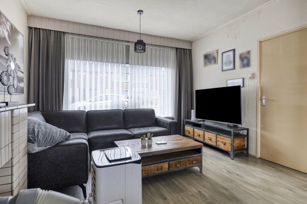 Bij binnenkomst via de hal (met toilet) valt direct de lichte en ruime woonkamer op. De grote raampartijen zorgen voor een prettige lichtinval en de praktische vaste kast biedt extra bergruimte. De gesloten keuken is van alle gemakken voorzien: een 4-pits gaskookplaat, afzuigkap, oven en koelkast. Aansluitend vindt u de ruime bijkeuken met witgoedaansluitingen en directe toegang tot de achtertuin.