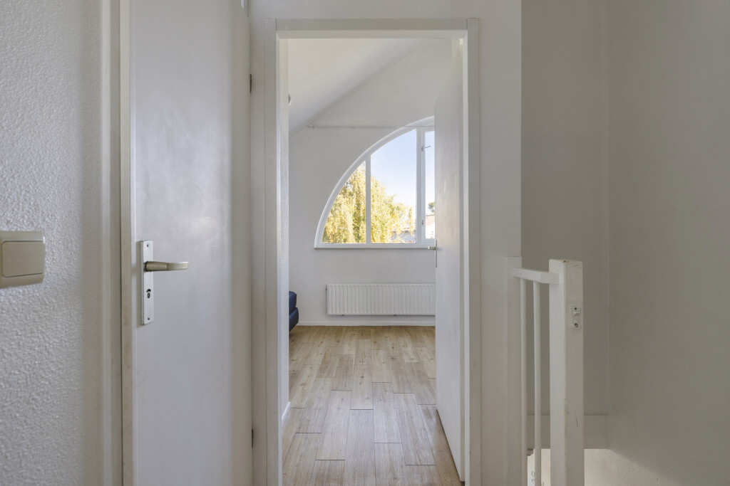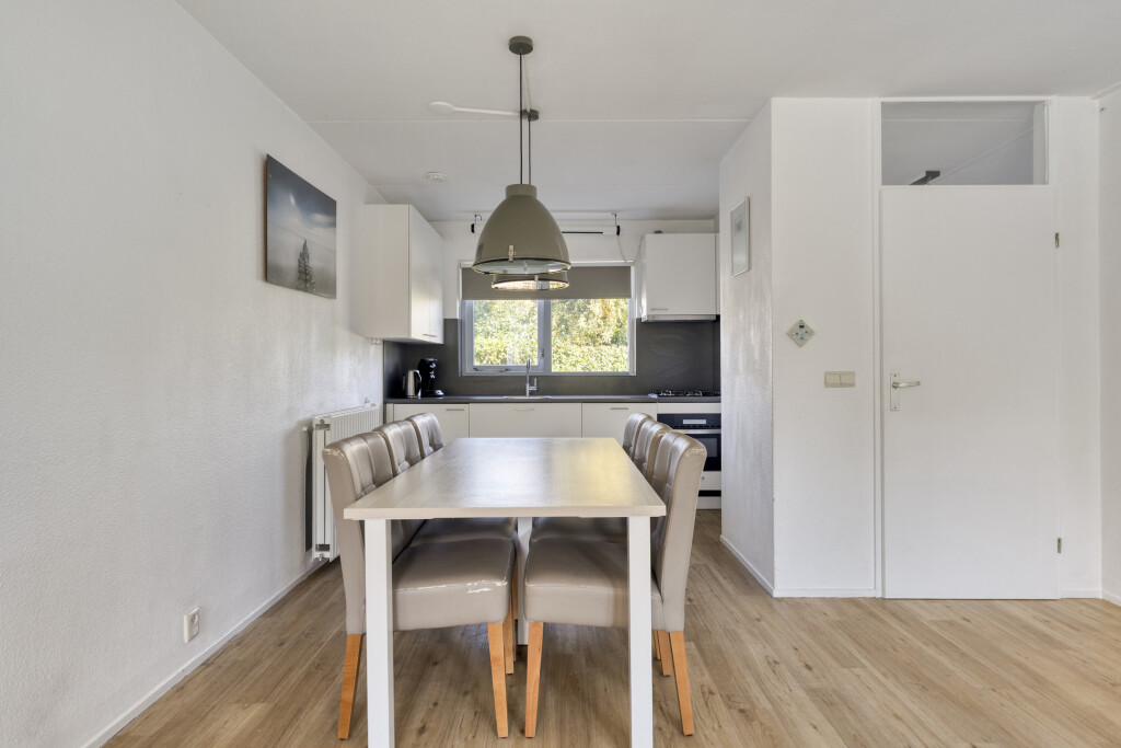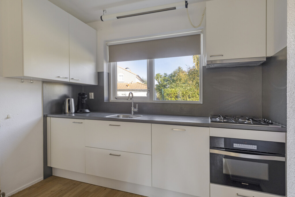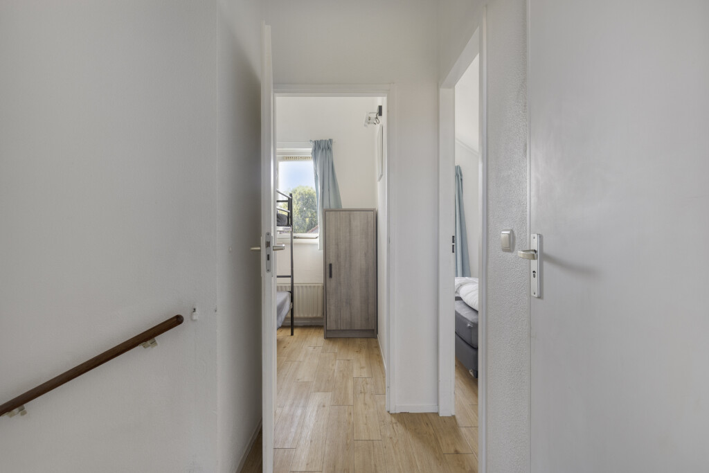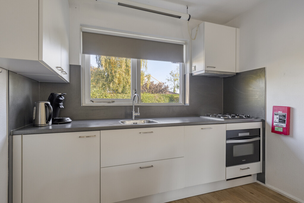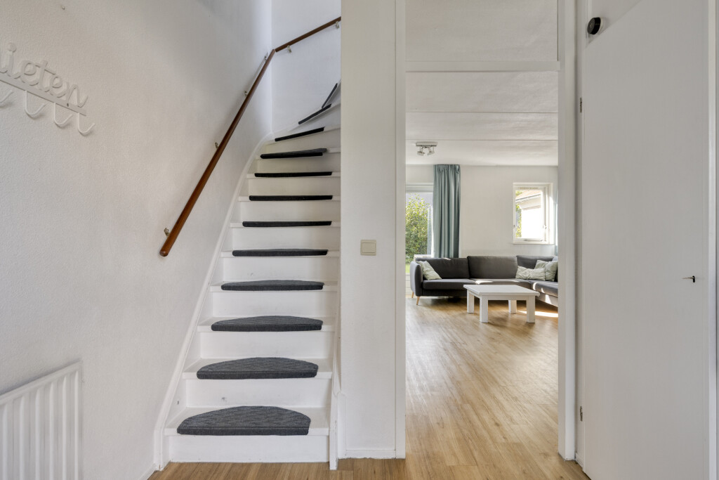 De lichte hal leidt u naar de ruime woonkamer met open keuken, voorzien van alle moderne gemakken: 4-pits gaskookplaat, afzuigkap, combi-oven, vaatwasser en koelkast. Openslaande deuren verbinden de woonkamer met de zonnige achtertuin, ideaal voor een ontbijtje in de ochtendzon of een barbecue in de avond. Op de begane grond vindt u ook een slaapkamer en een badkamer, perfect voor gelijkvloers wonen.