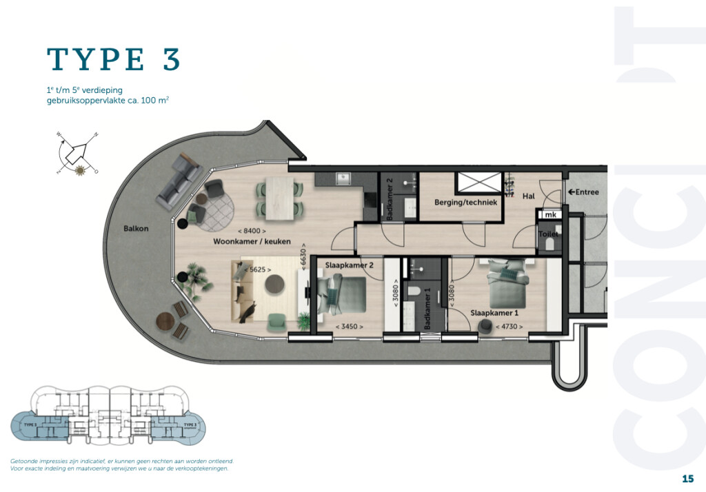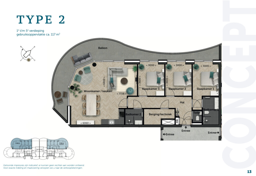 Type 2, gelegen aan havenzijde, heeft 3 slaapkamers