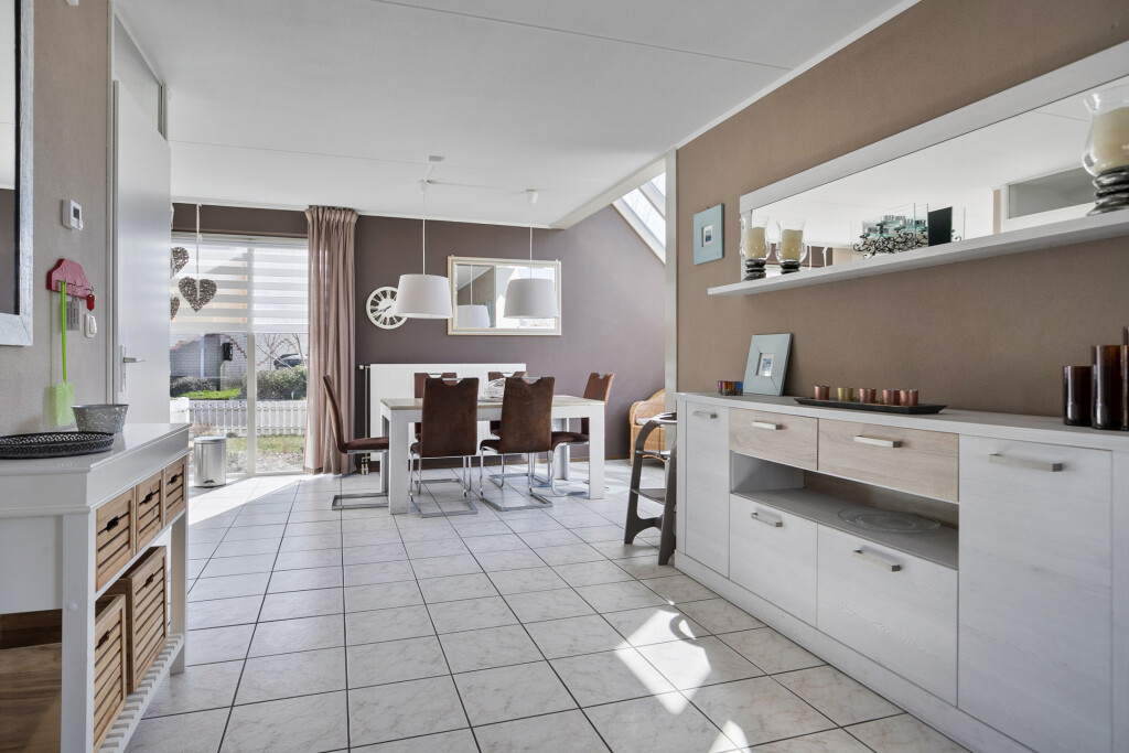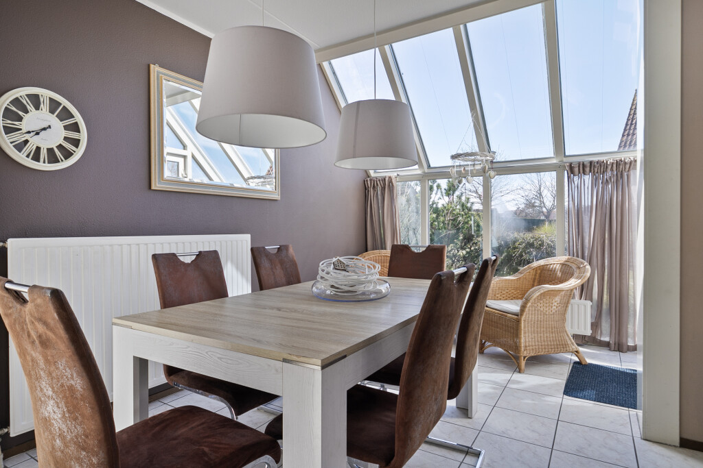 Bij binnenkomst treft u een ruime hal met toegang tot de toiletruimte en de trap naar de eerste verdieping. De lichte woonkamer met open keuken is voorzien van inbouwapparatuur, waaronder een 4-pits gaskookplaat, afzuigkap, combi-oven, koelkast en vaatwasser. Daarnaast beschikt de keuken over een kleine bar. De woonkamer is uitgebouwd met een serre, die zorgt voor extra lichtinval. Vanuit de serre en de woonkamer heeft u via openslaande deuren directe toegang tot de tuin.
