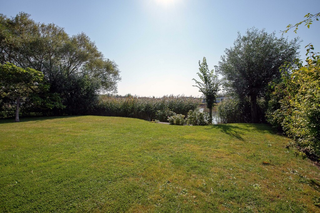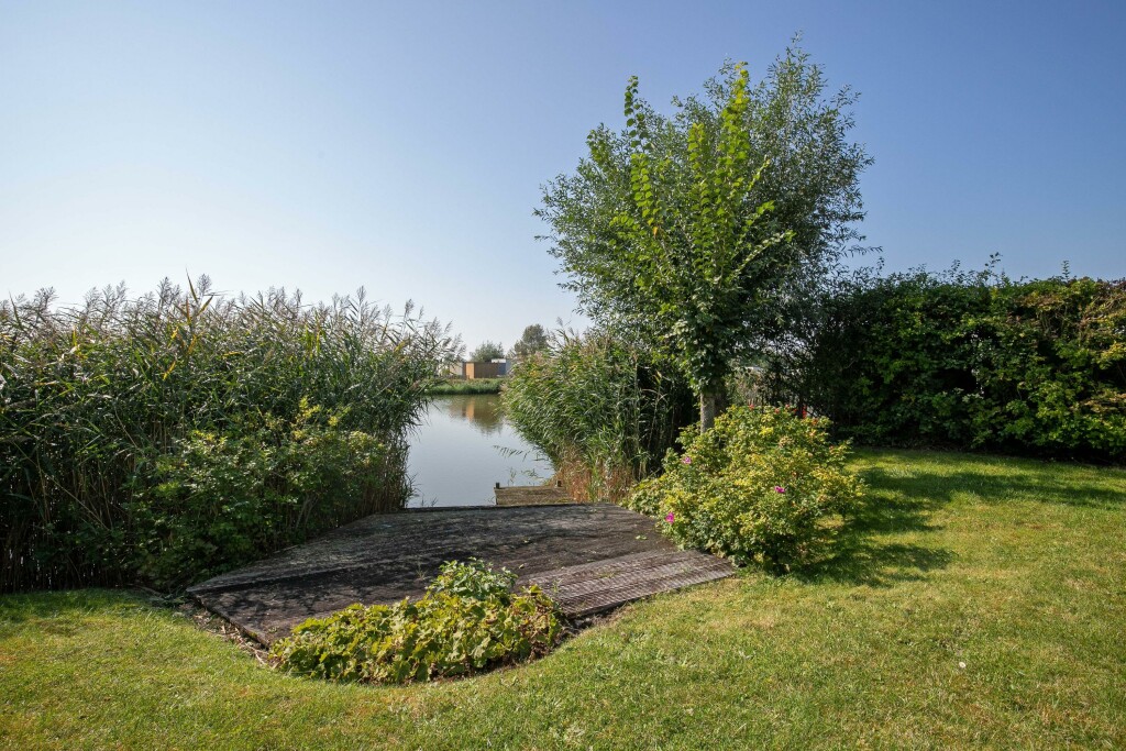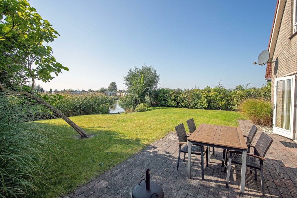 * ruime achtertuin rondom gelegen aan een waterpartij;