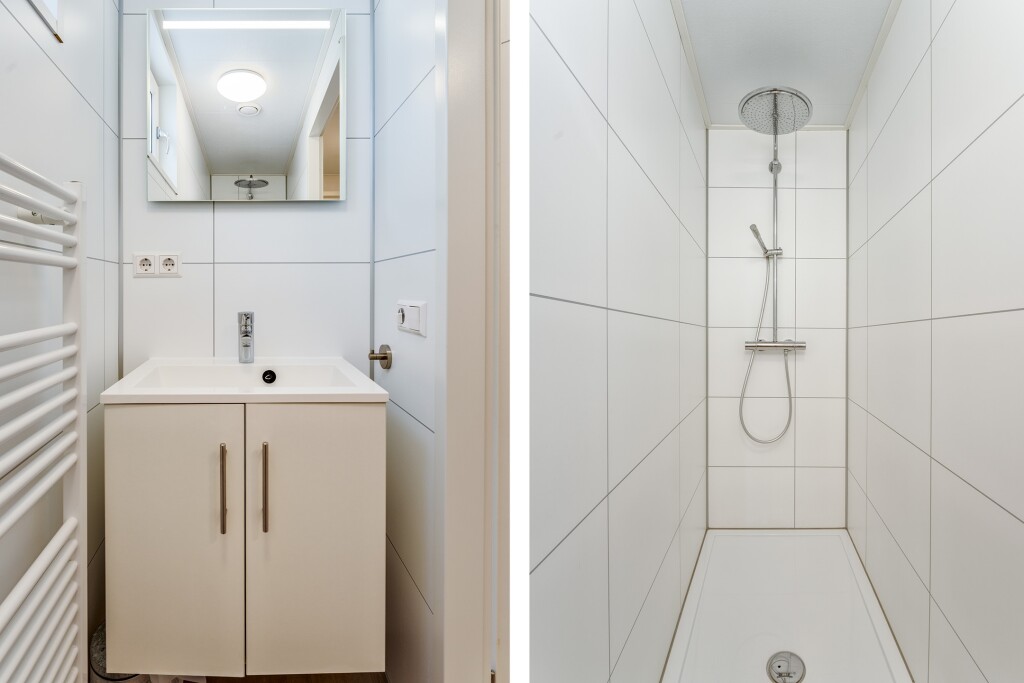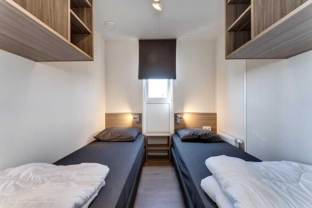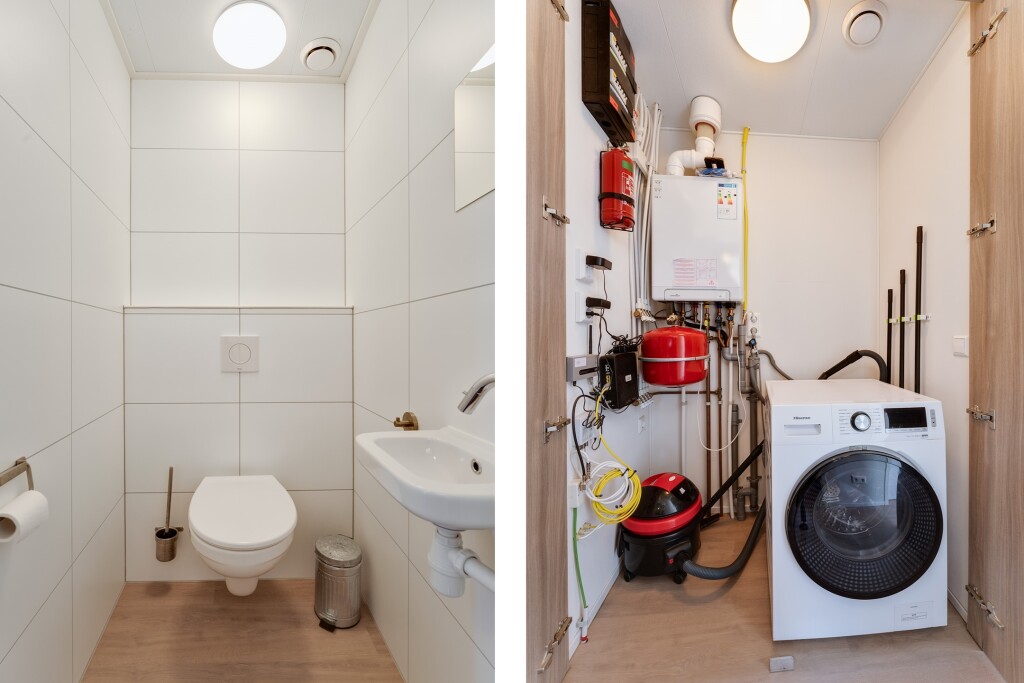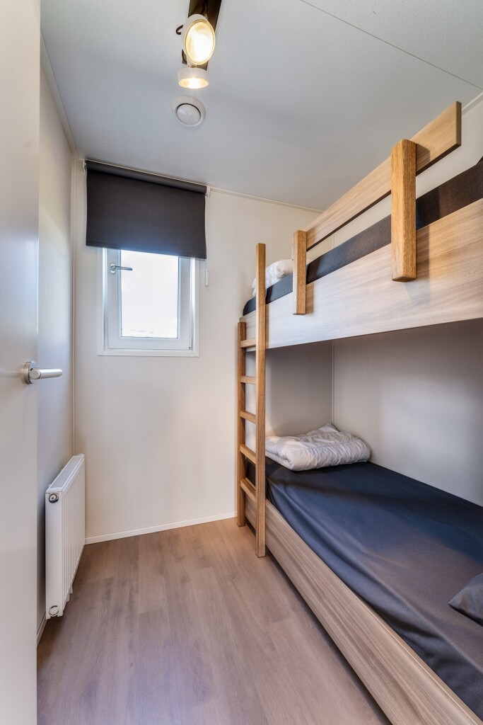Verder beschikt de woning over drie slaapkamers, waarvan één met vaste kastruimte en één met een stapelbed. De badkamer is voorzien van een douche en wastafelmeubel. Daarnaast is er een berging en aparte toiletruimte met een hangtoilet en fontein.