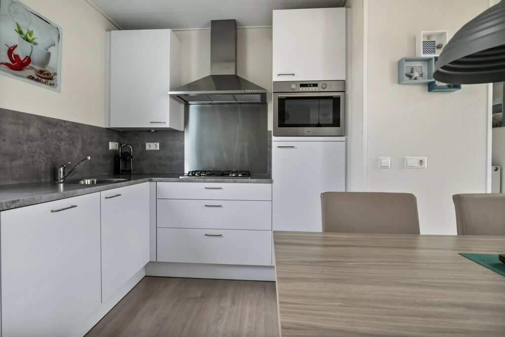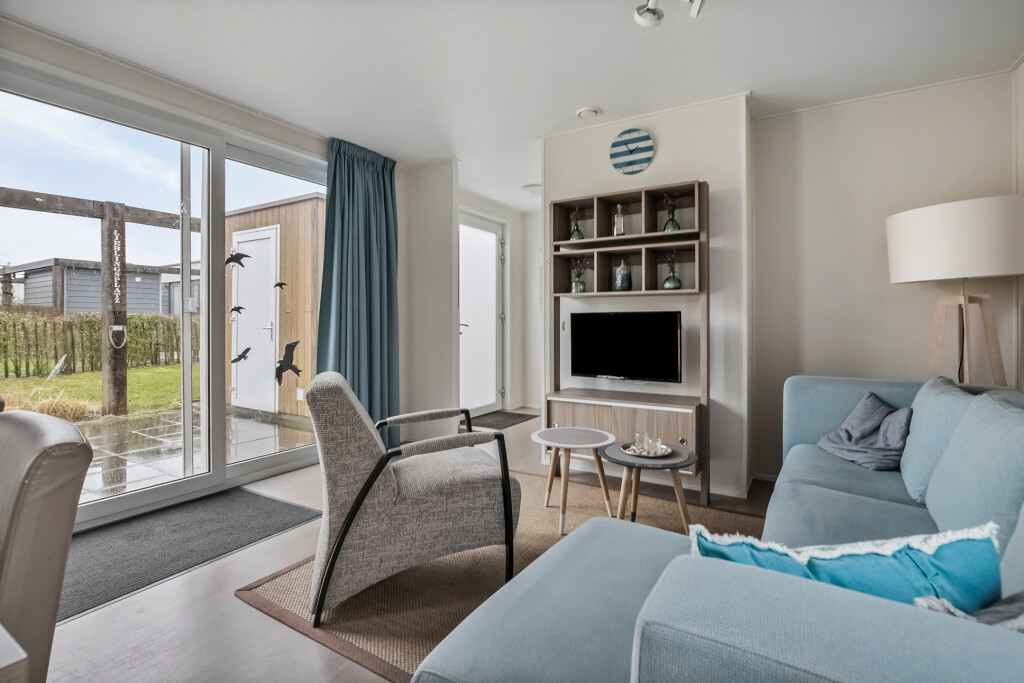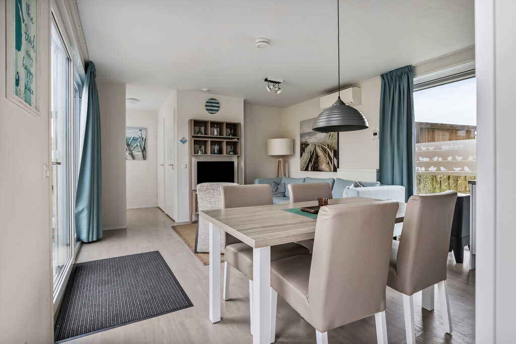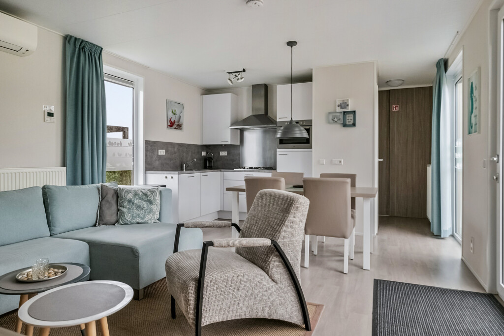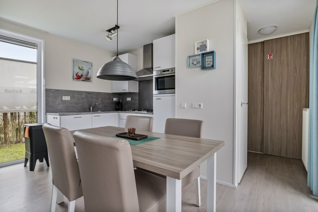 Bij binnenkomst in de hal heeft u toegang tot alle vertrekken. In het midden van de lodge bevindt zich de ruime woonkamer, waar grote raampartijen zorgen voor veel natuurlijk licht. Via de schuifdeuren heeft u direct toegang tot de tuin. De open keuken is voorzien van diverse inbouwapparatuur, waaronder een 4-pits gaskookplaat, afzuigkap, combi-oven, koelkast en vaatwasser (2025).