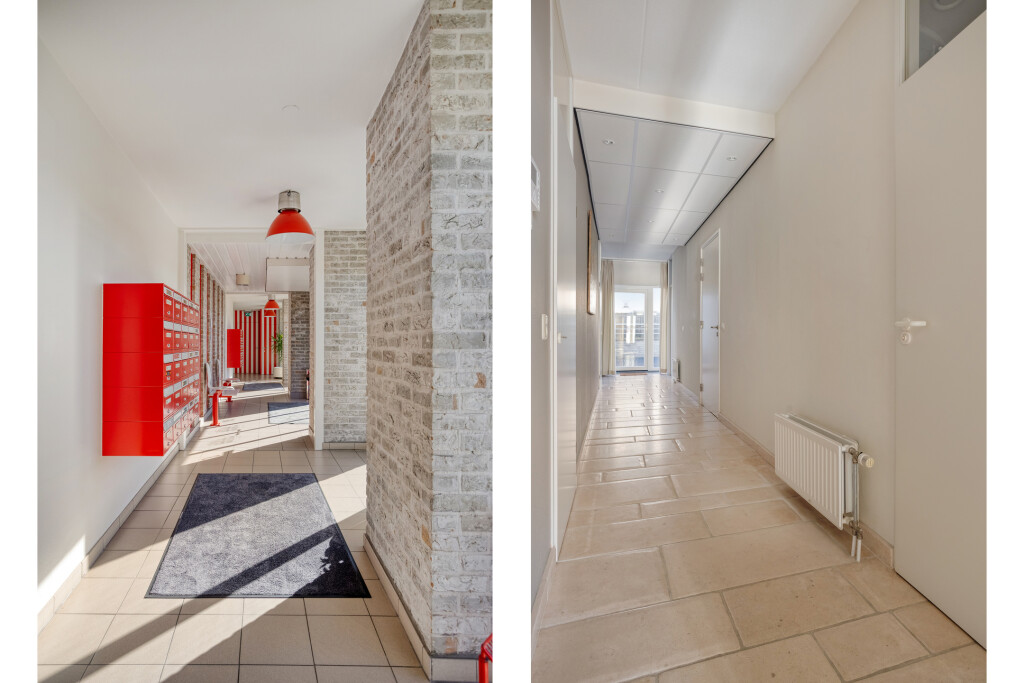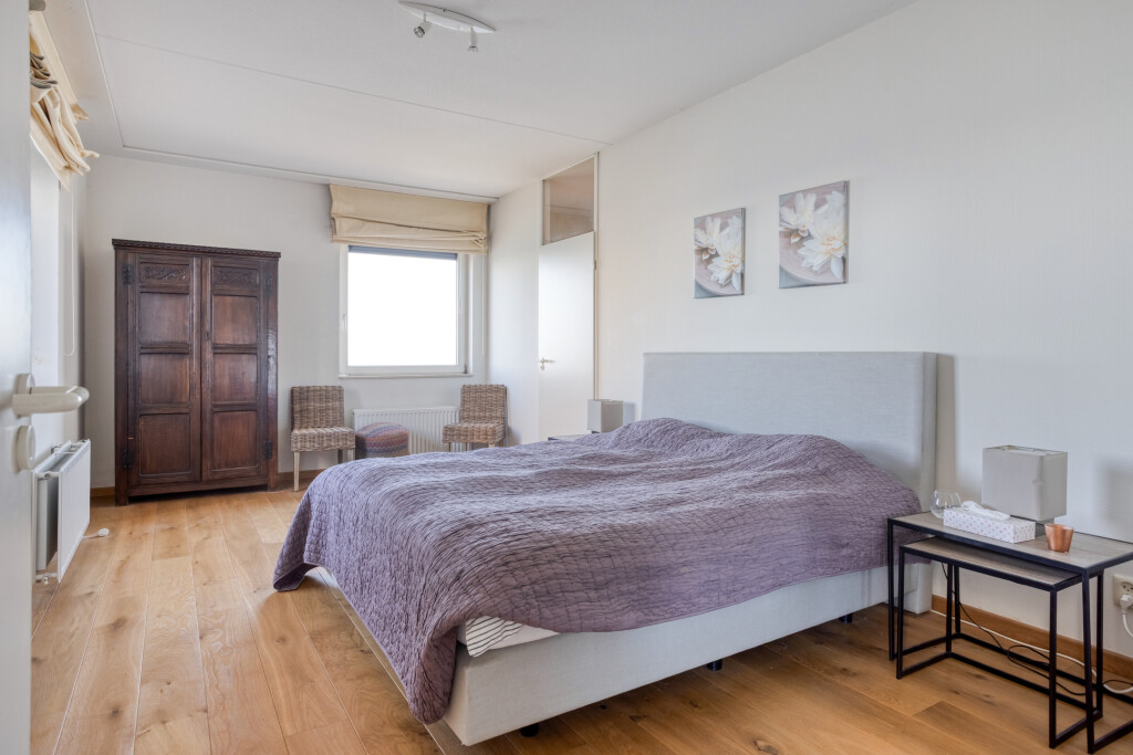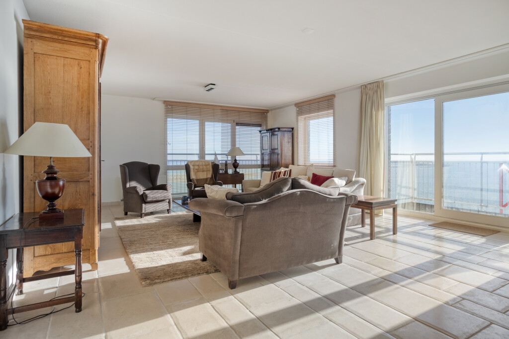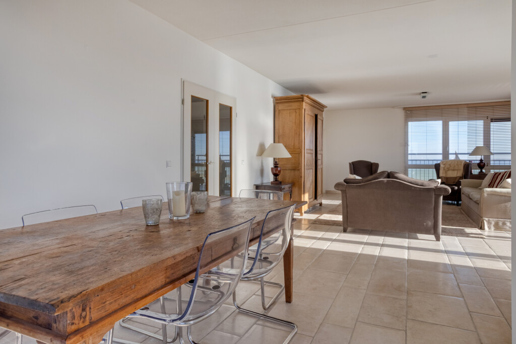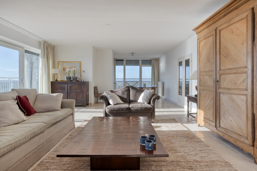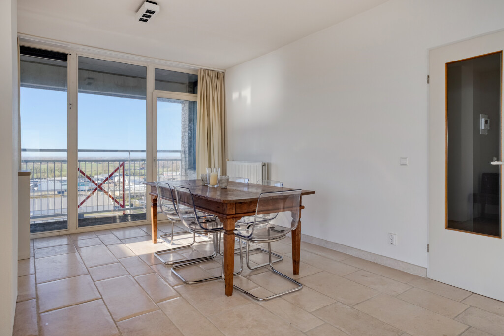 Vanuit de lift stapt u direct de hal van het appartement binnen, die de verbinding vormt naar de verschillende leefruimtes. De lichte en royale woonkamer valt direct op door de grote raampartijen, die zorgen voor een overvloed aan natuurlijk daglicht en een panoramisch zicht. Via de schuifpui bereikt u het balkon, waar u ongestoord geniet van het indrukwekkende uitzicht over de Westerschelde en het landschap.