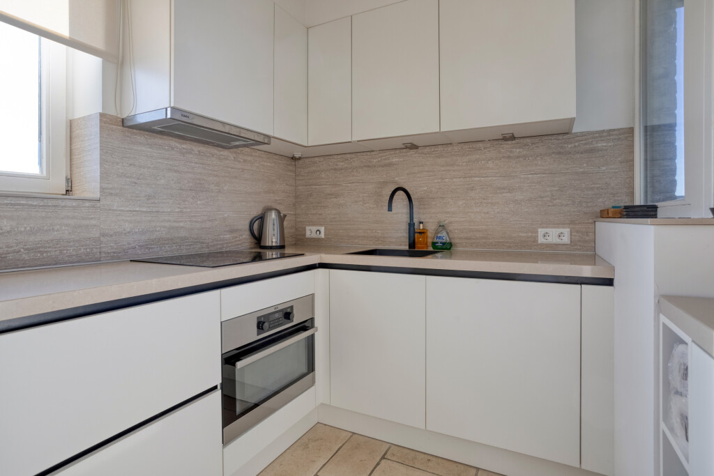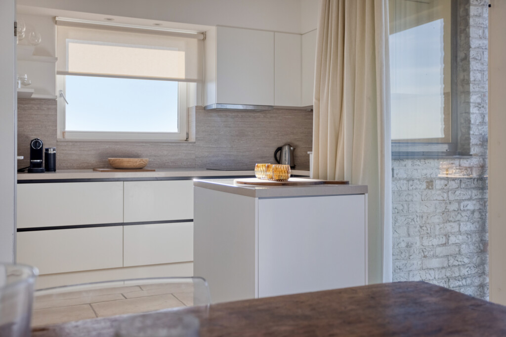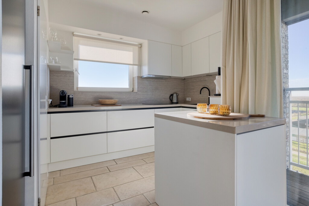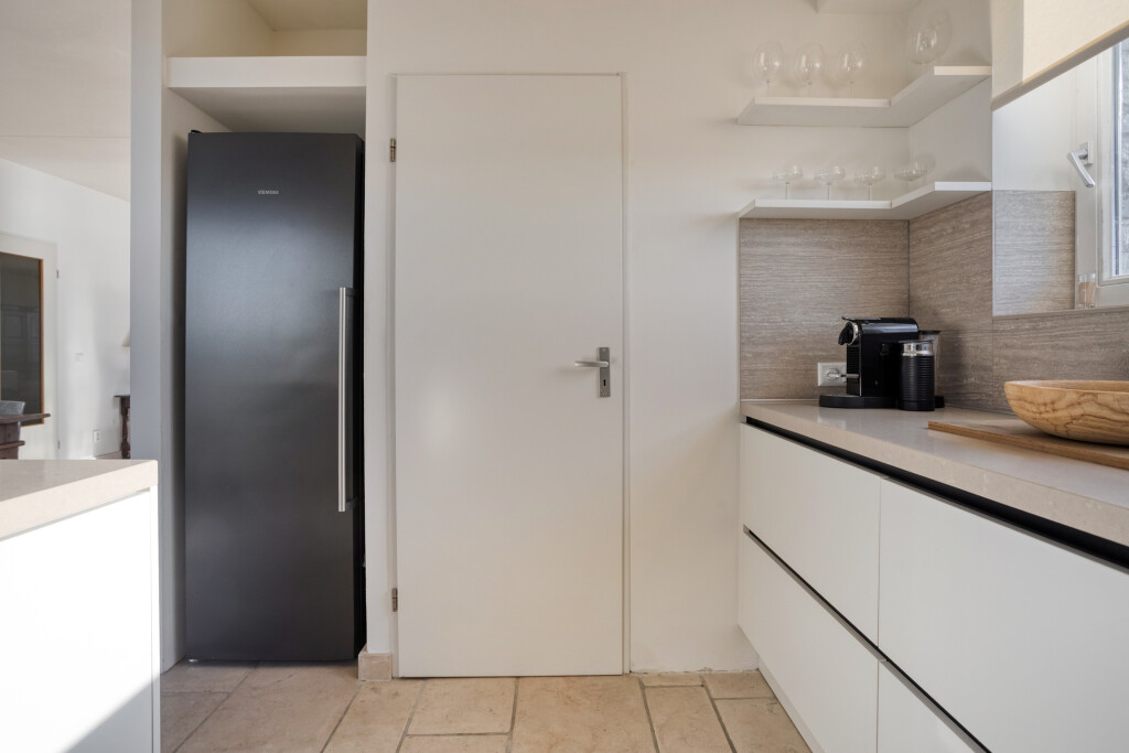De open keuken sluit naadloos aan op de living en is hoogwaardig uitgerust met een inductiekookplaat, afzuigkap, oven, vaatwasser en een Quooker. Een praktische, aangrenzende berging biedt extra ruimte voor uw voorraad. Vanuit de woonkamer biedt een openslaande deur bovendien toegang tot een tweede buitenruimte, met een weids zicht op het Zeeuwse landschap.