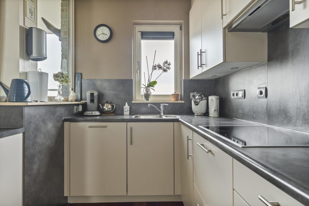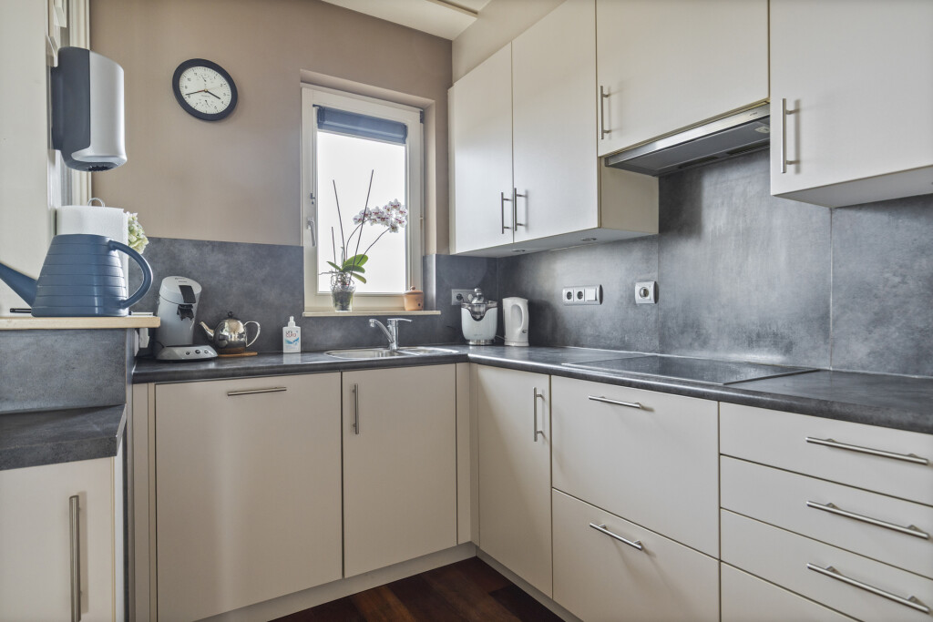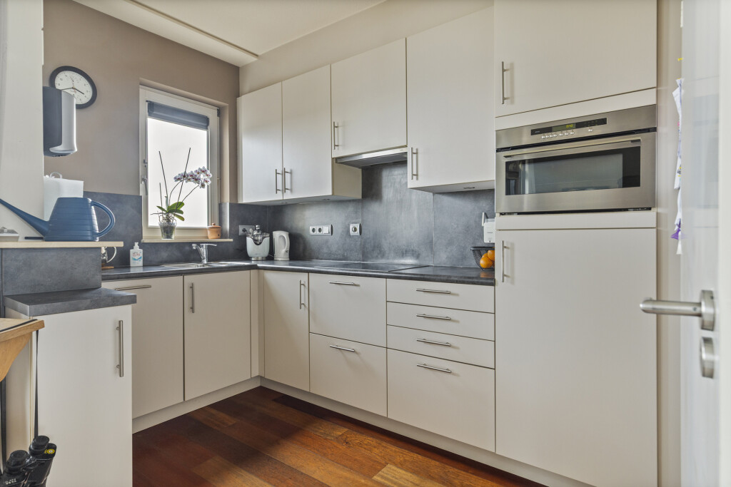 De open inbouwkeuken sluit naadloos aan op de woonkamer en is volledig uitgerust met diverse inbouwapparatuur, waaronder een keramische kookplaat met afzuigkap, een combi-oven, een koelkast met vriesvak en een vaatwasser. Vanuit de keuken is de praktische berging bereikbaar, waar zich tevens de cv-installatie bevindt en waar voldoende ruimte is voor extra opslag.