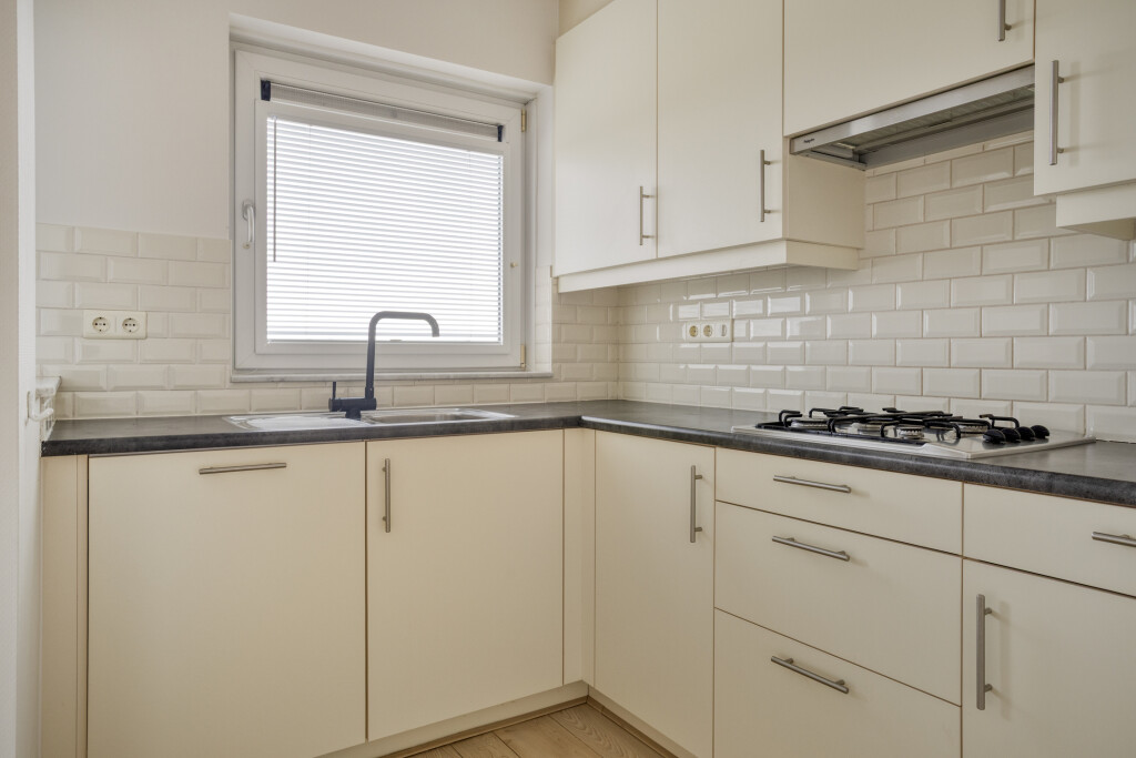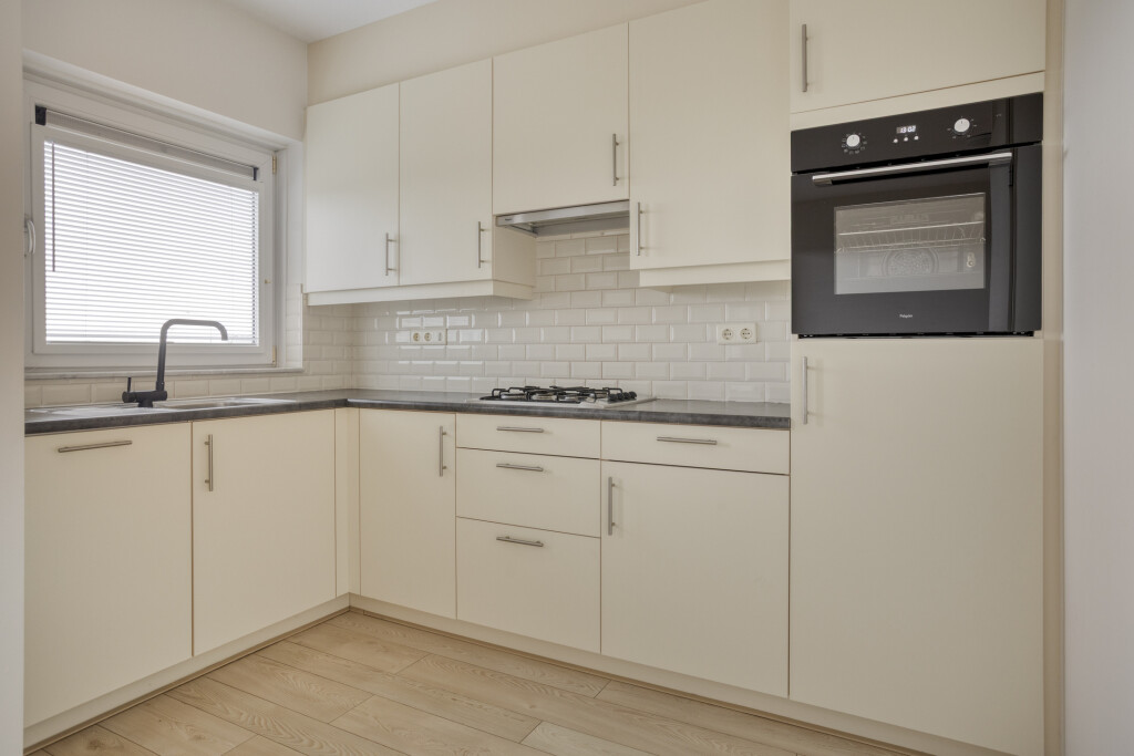 Aangrenzend aan de woonkamer bevindt zich de open inbouwkeuken, uitgerust met een 4-pits gaskookplaat met afzuigkap, oven, koelkast en vaatwasser. Vanuit de keuken heeft u toegang tot een praktische berging met de cv-installatie, ideaal voor extra opslag of voorraad.