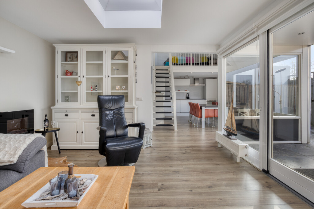 Via de openslaande deuren betreedt u de woning en komt u in de woonkamer. De woonkamer met sfeerhaard bevindt zich in de uitbouw en is voorzien van dakramen, waardoor er veel natuurlijk daglicht binnenvalt. In open verbinding bevindt zich de eetkamer met open keuken.