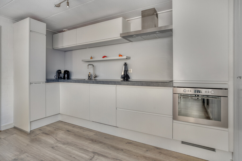 De keuken is uitgerust met diverse inbouwapparatuur, waaronder een inductiekookplaat, afzuigkap, combi-oven, koelkast en vaatwasser. Vanuit de keuken heeft u middels een deur toegang tot de garderobe.