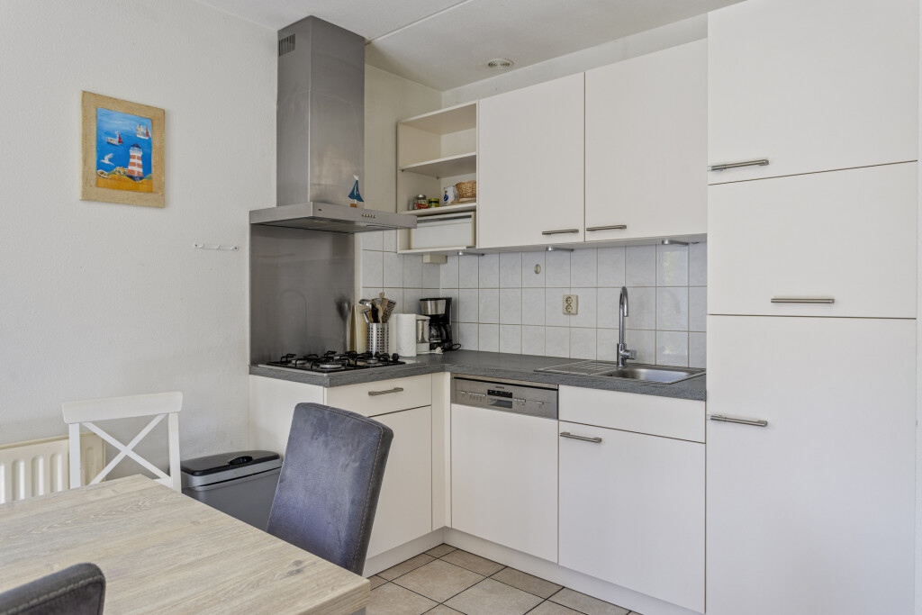 Binnenkomst in de hal met toegang tot de toiletruimte, trapopgang en de lichte woonkamer met grote raampartijen. De open keuken is uitgerust met een 4-pits gaskookplaat met afzuigkap, magnetron, koelkast en vaatwasser. Via schuifdeuren bereikt u de achtertuin. Verder vindt u op de begane grond een slaapkamer en een badkamer met ligbad en wastafelmeubel.