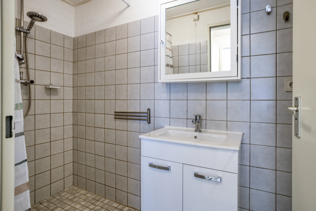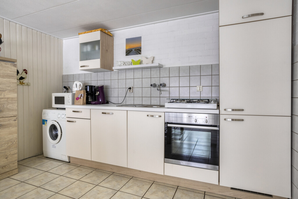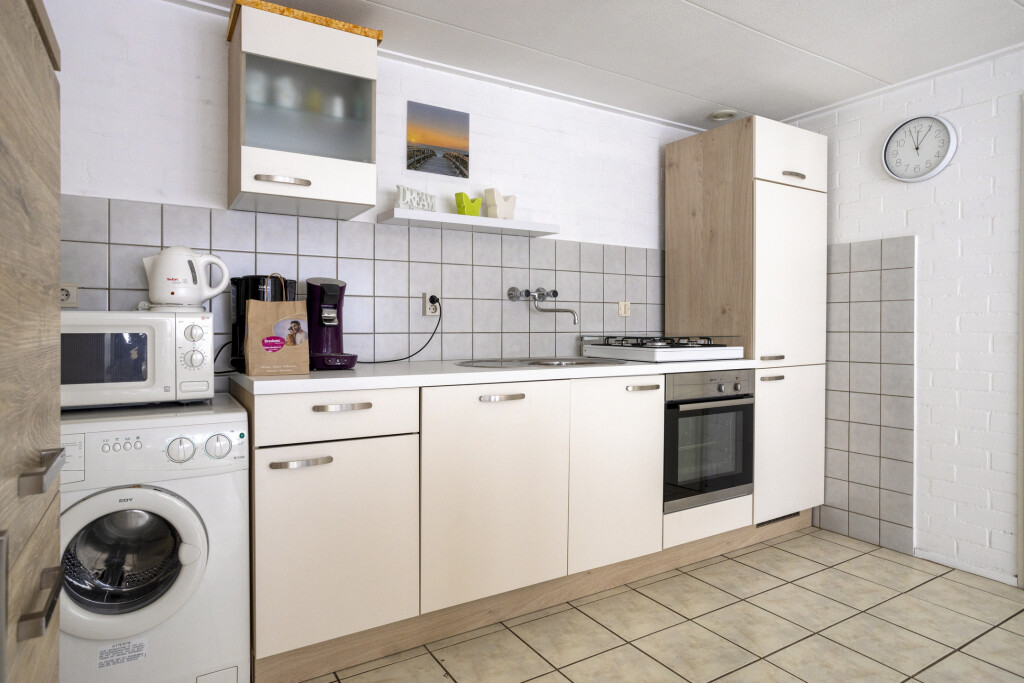 U komt binnen in de hal die toegang geeft tot de lichte woonkamer met openslaande deuren naar de zonnige tuin. De open keuken is voorzien van diverse inbouwapparatuur, waaronder een gaskookplaat, koelkast met vriesvak, vaatwasser en een wasmachine. Op de begane grond bevinden zich verder een slaapkamer, een aparte toiletruimte en een badkamer met douche en wastafel.