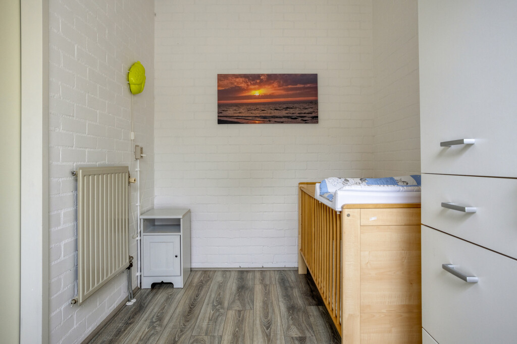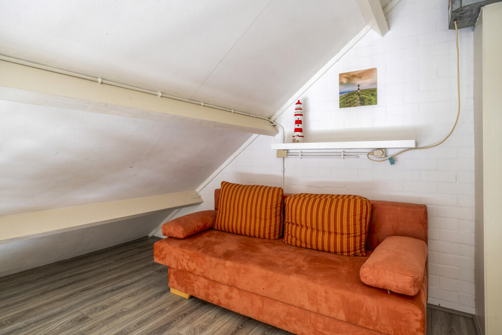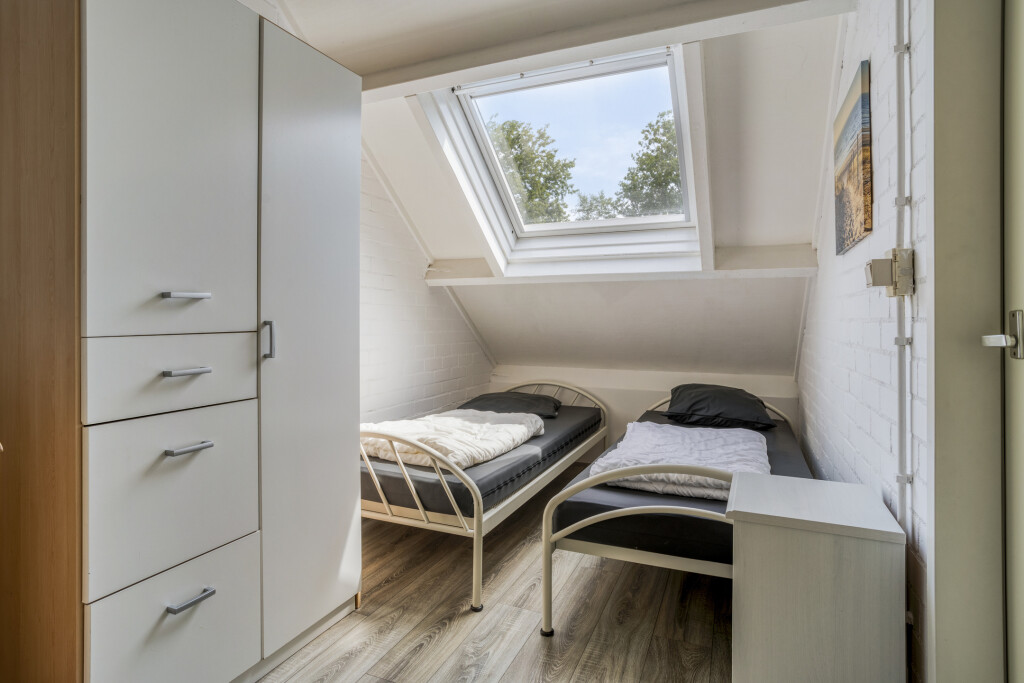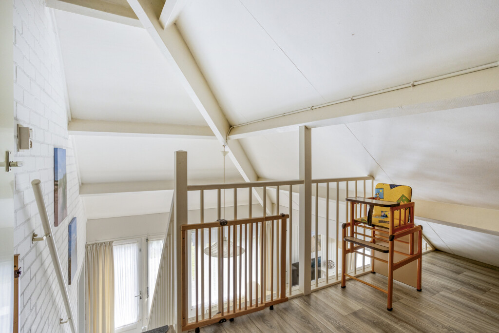 Via de trap in de woonkamer komt u op de overloop met vide. Hier vindt u een tweede slaapkamer met dakraam en extra ruimte op de overloop, bijvoorbeeld als werk- of hobbyhoek.