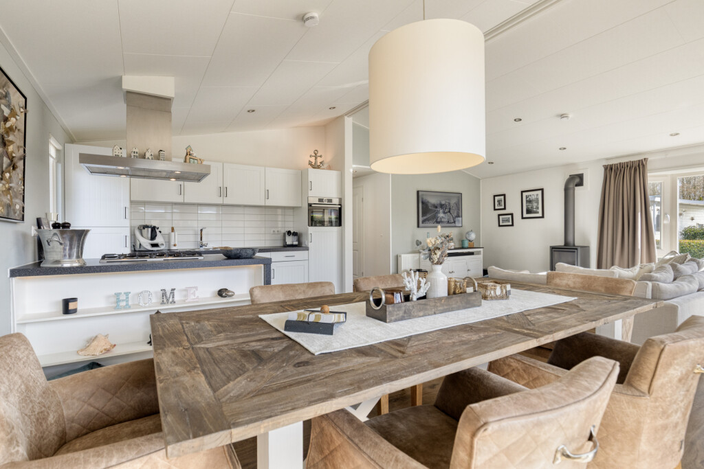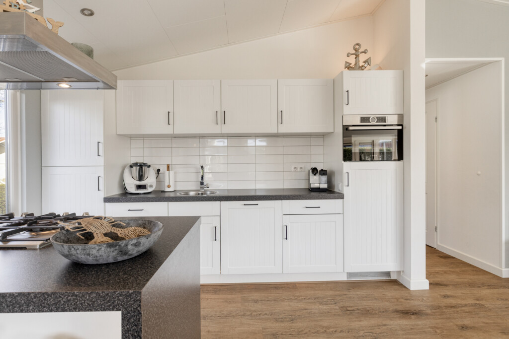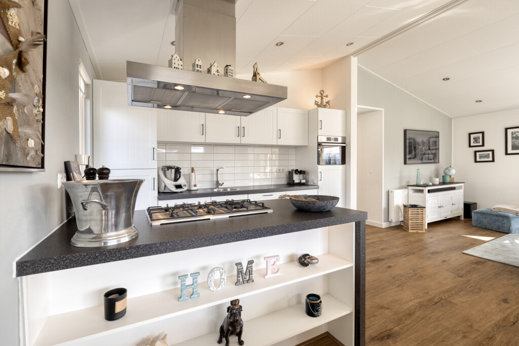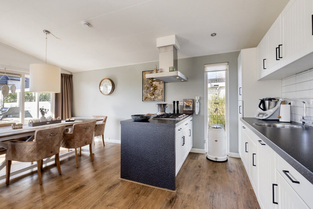 U komt binnen in de entree, die toegang biedt tot alle vertrekken. De ruime en lichte woonkamer met eethoek beschikt over grote raampartijen en staat in directe verbinding met het terras. Dit zorgt voor een prettige lichtinval en een vloeiende overgang naar buiten. De woonkamer is sfeervol ingericht en voorzien van een luxe gaskachel. De open keuken sluit naadloos aan op de woonkamer en is uitgerust met een kookeiland en diverse inbouwapparatuur, waaronder een 4-pits gaskookplaat, afzuigkap, oven, koelkast met vriesvak en een vaatwasser (vernieuwd in 2020).