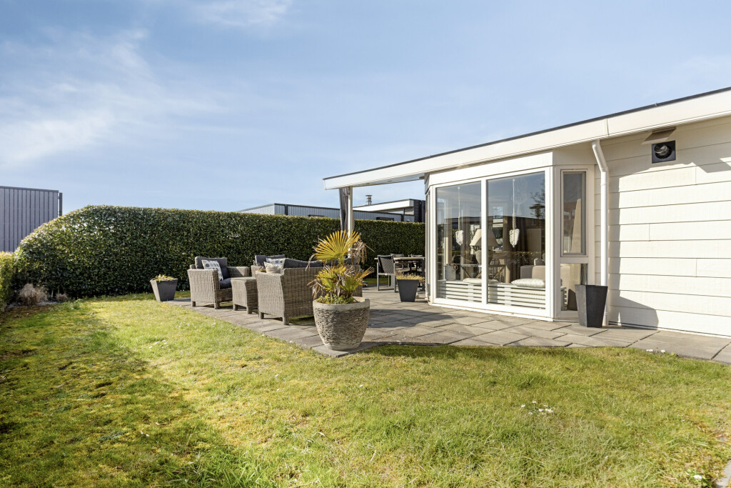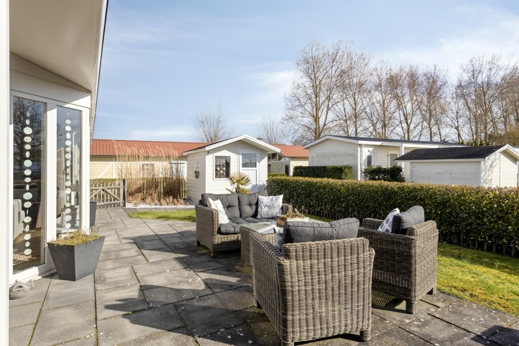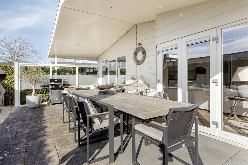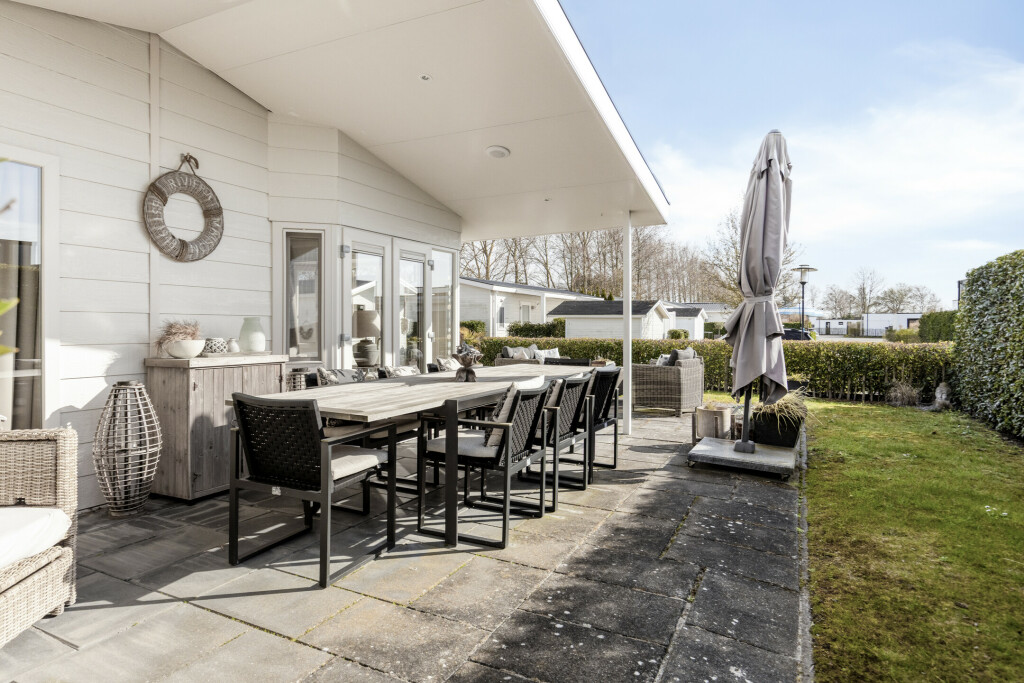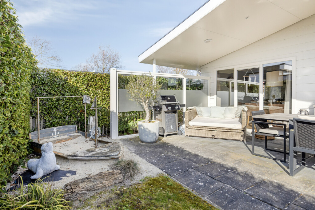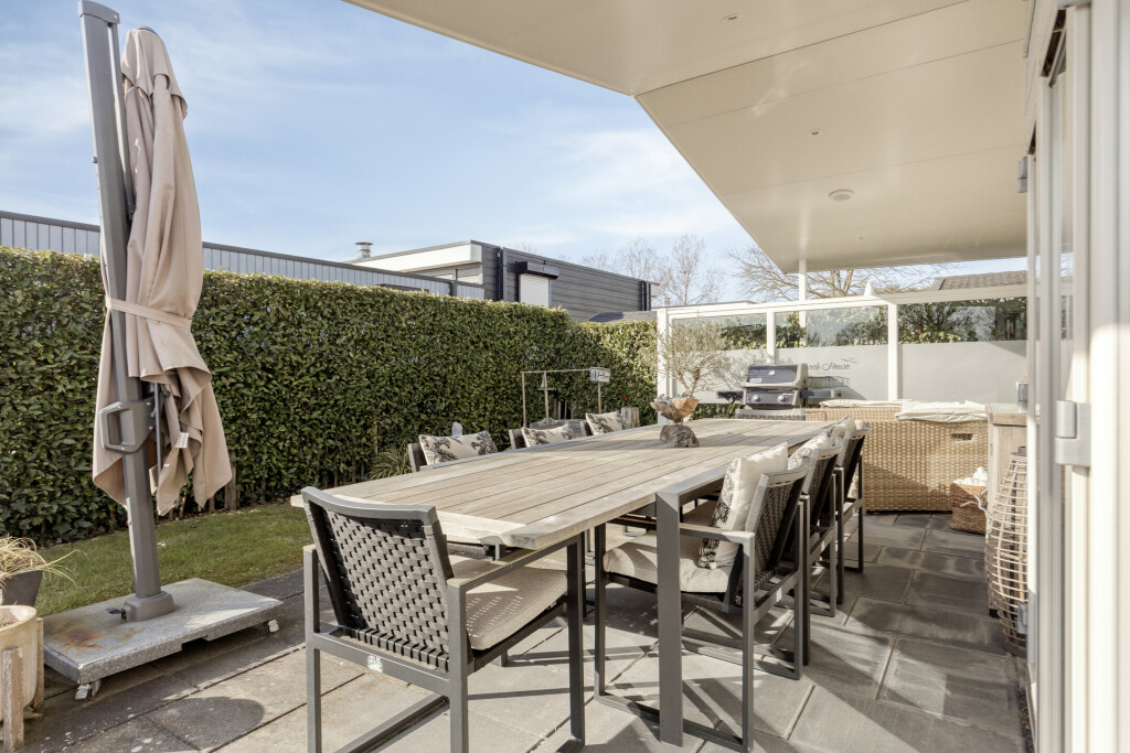 De woning beschikt over een heerlijk zonnig terras met overkapping, dat zich uitstrekt over de gehele breedte van de woning. Hier is volop ruimte voor een gezellige zit- of eethoek, zodat u optimaal kunt genieten van het buitenleven. Het perceel is compleet met een eigen parkeerplaats en een tuinhuis.