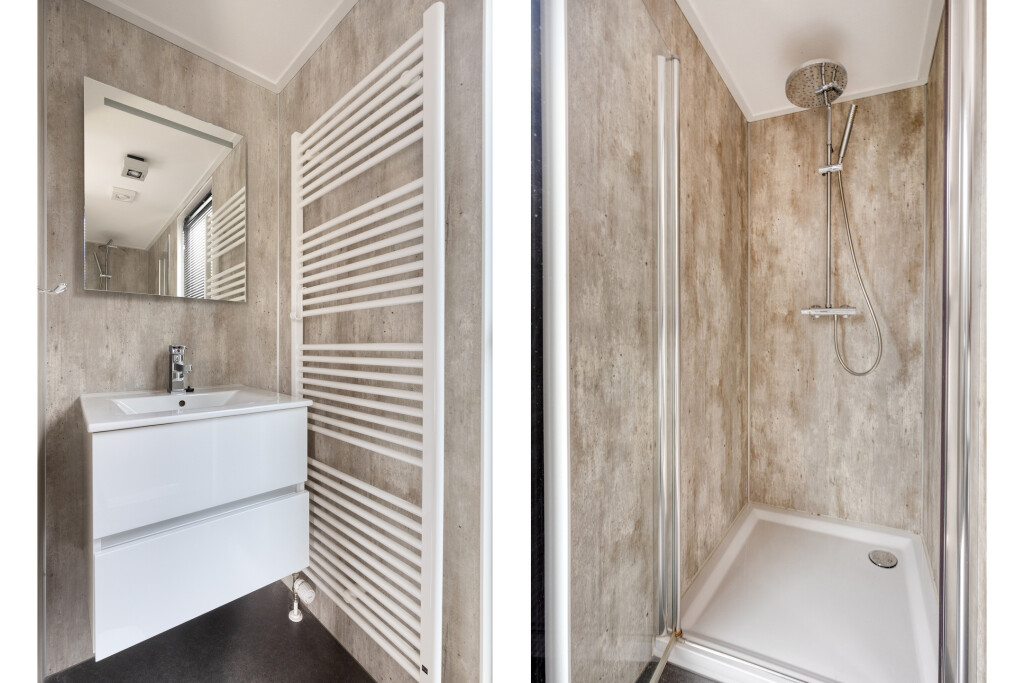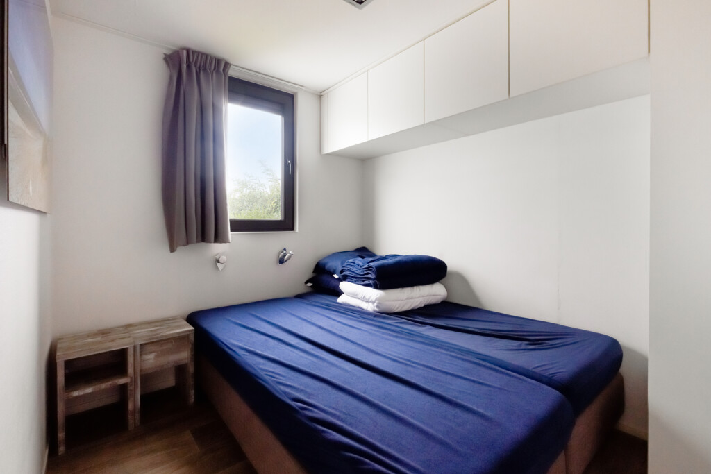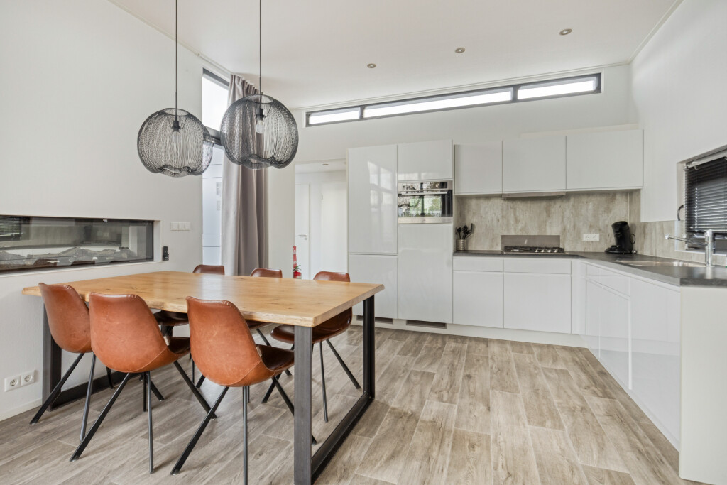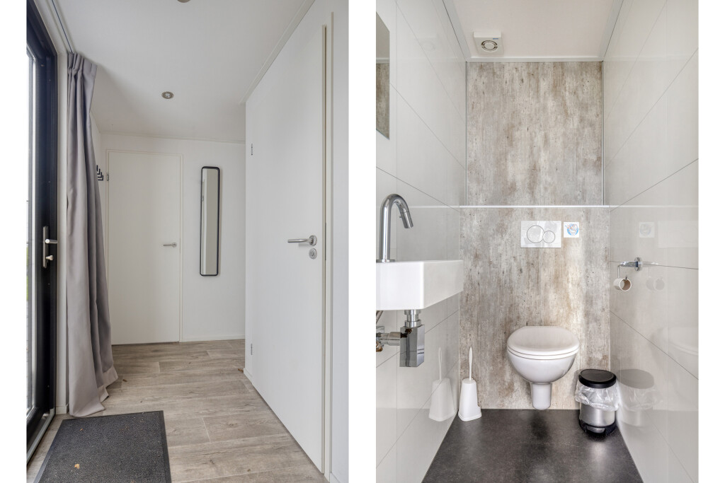Entree in de hal met toiletruimte, voorzien van een hangtoilet en fontein. De ruime woonkamer beschikt over een sfeervolle elektrische haard bij de eethoek en een schuifpui naar het terras. De open inbouwkeuken is compleet uitgerust met een 4-pits gaskookplaat, afzuigkap, combi-oven, koelkast, vriezer en vaatwasser. Het chalet beschikt over drie slaapkamers, waarvan één slaapkamer is voorzien van een badkamer en-suite met douche en wastafelmeubel. Daarnaast is er een tweede badkamer met inloopdouche en dubbel wastafelmeubel aanwezig.