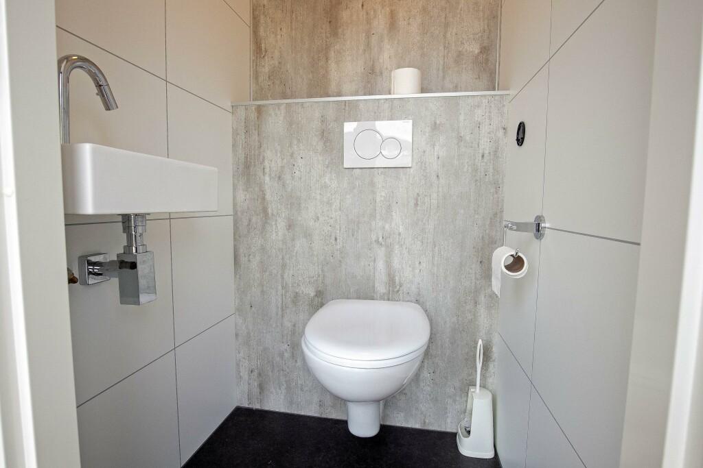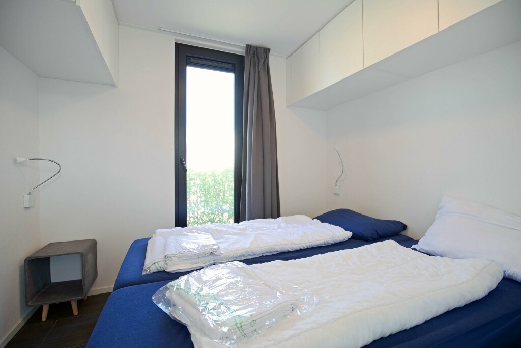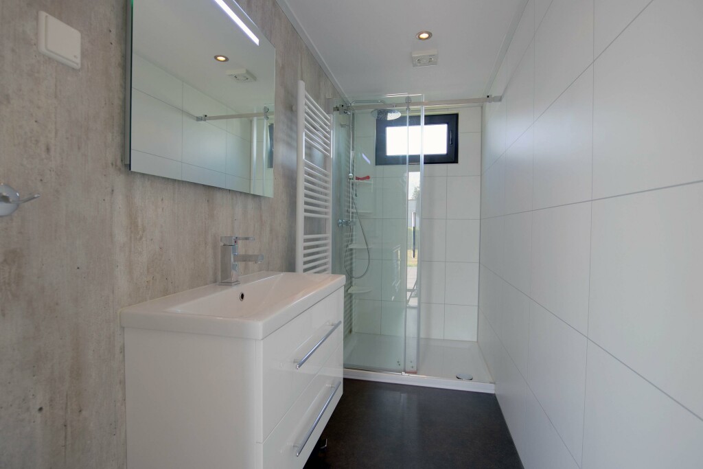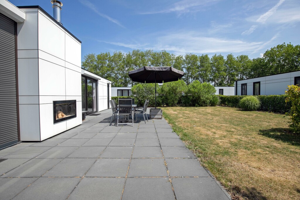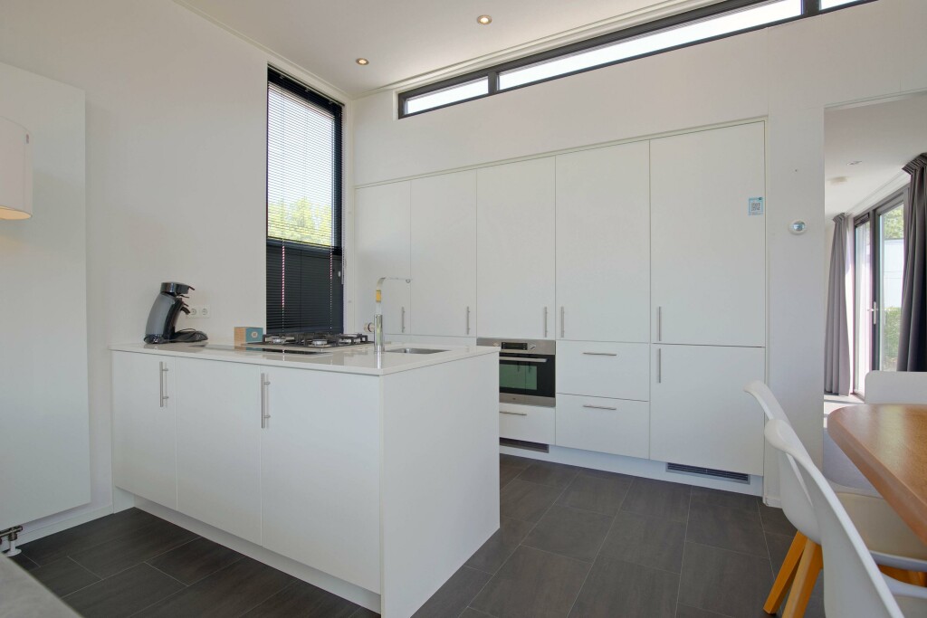 Indeling: hal met toiletruimte voorzien van een hangtoilet en fontein. Aan de linkerzijde bevindt zich de riante woonkamer met sfeerhaard en schuifpui naar het terras. De luxe inbouwkeuken beschikt over een gas-kookplaat, geïntegreerde afzuigkap, combi-oven, koelkast, diepvries en vaatwasser. Het chalet heeft 3 slaapkamers waarvan 2 voorzien van vaste kasten. De badkamer is voorzien van inloopdouche en wastafel.