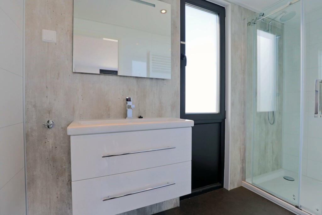 Indeling: entree in de hal met toiletruimte voorzien van een hangtoilet en fontein. Aan de linkerzijde bevindt zich de riante woonkamer met sfeerhaard, verhoogd plafond en schuifpui naar het terras. De luxe inbouwkeuken beschikt over een gas-kookplaat, geïntegreerde afzuigkap, combi-oven, koelkast en vaatwasser. Verder zijn er twee slaapkamers aanwezig beiden met toegang tot de badkamer. Eén slaapkamer beschikt over een inloopkast en toegang tot de inpandige berging. De badkamer is voorzien van een douche en wastafelmeubel.