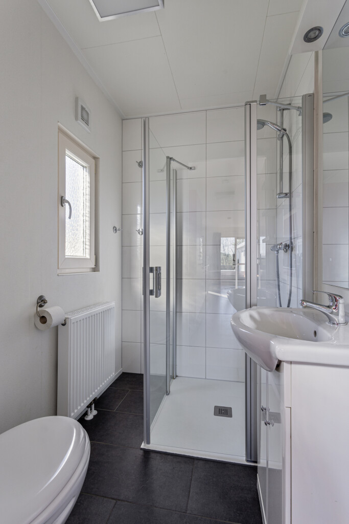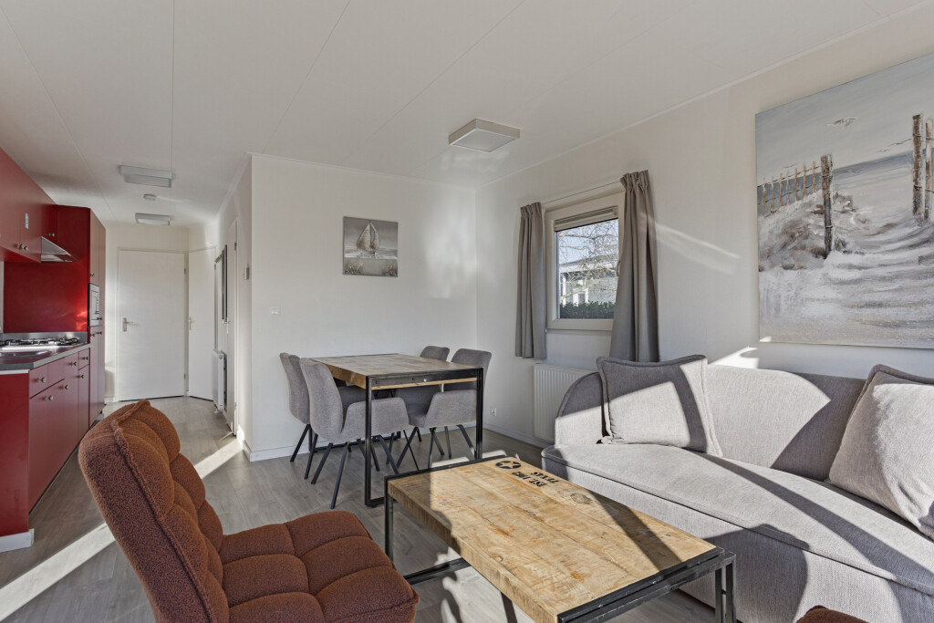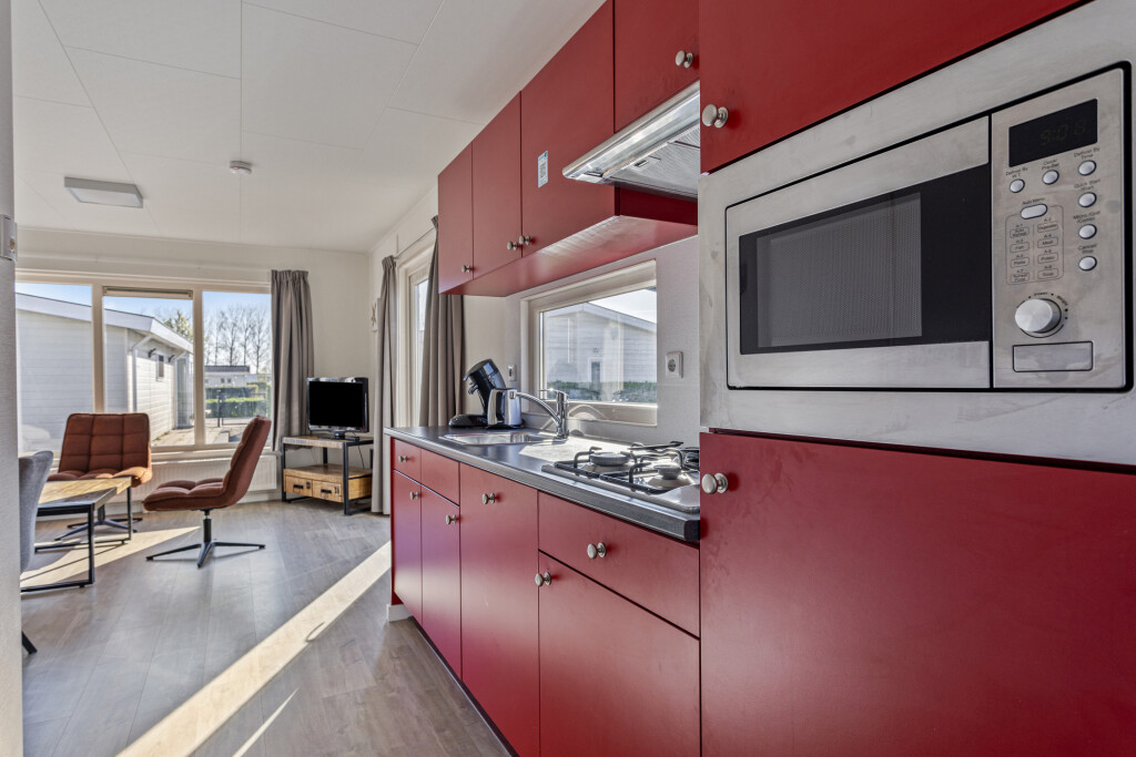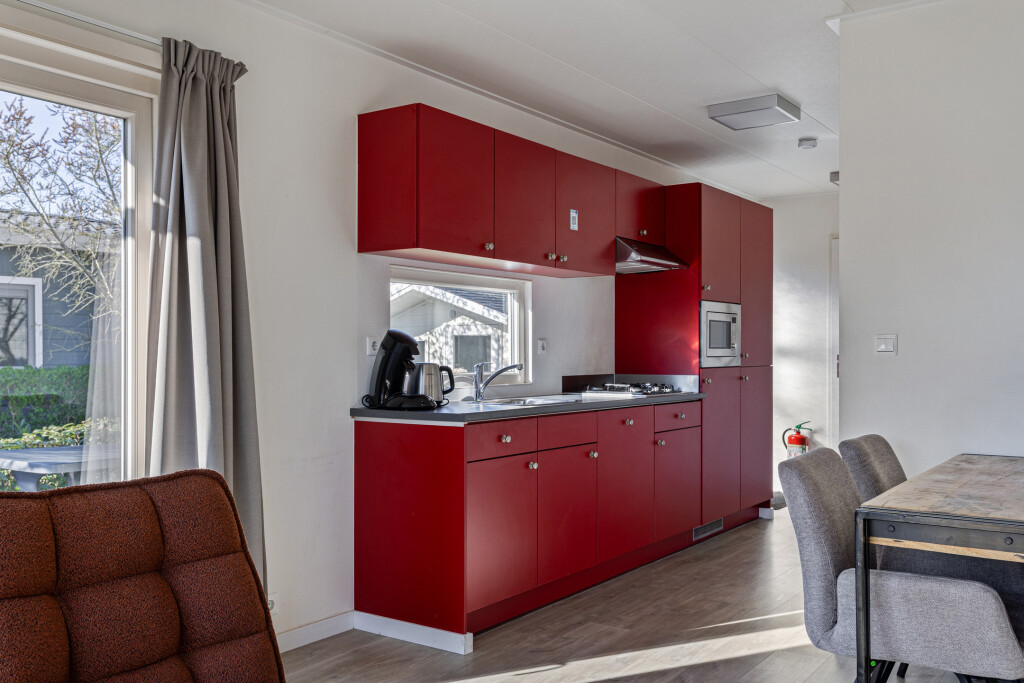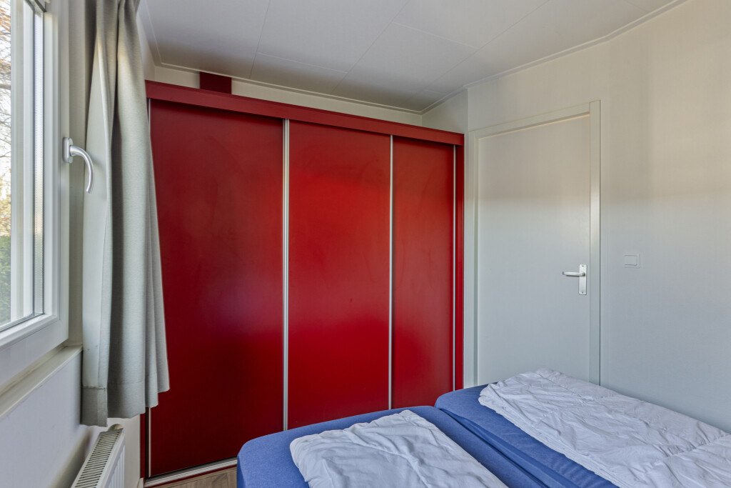 Bij binnenkomst komt u in de hal, die toegang biedt tot de badkamer. Deze is vernieuwd in 2023 en uitgerust met een inloopdouche, wastafelmeubel en toilet. Vanuit de hal betreedt u de lichte, ruime woonkamer met grote raampartijen en openslaande deuren naar de tuin en het terras. De open inbouwkeuken is voorzien van een 4-pits gaskookplaat, afzuigkap, magnetron, vaatwasser en een koelkast met vriesvak. Het chalet beschikt daarnaast ook over twee slaapkamers, waarvan één met een vaste kast.