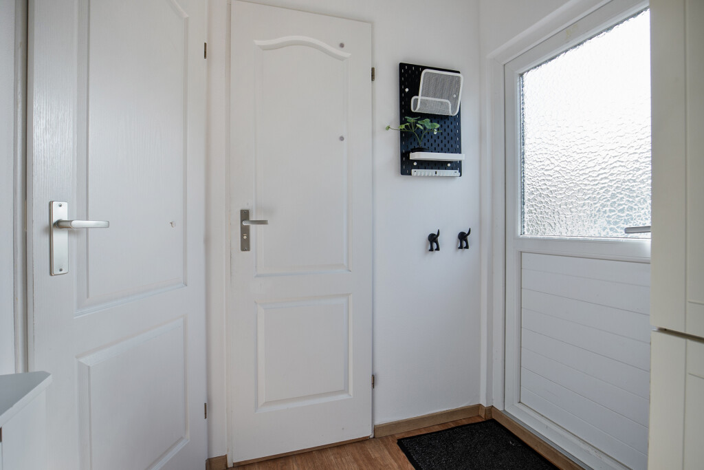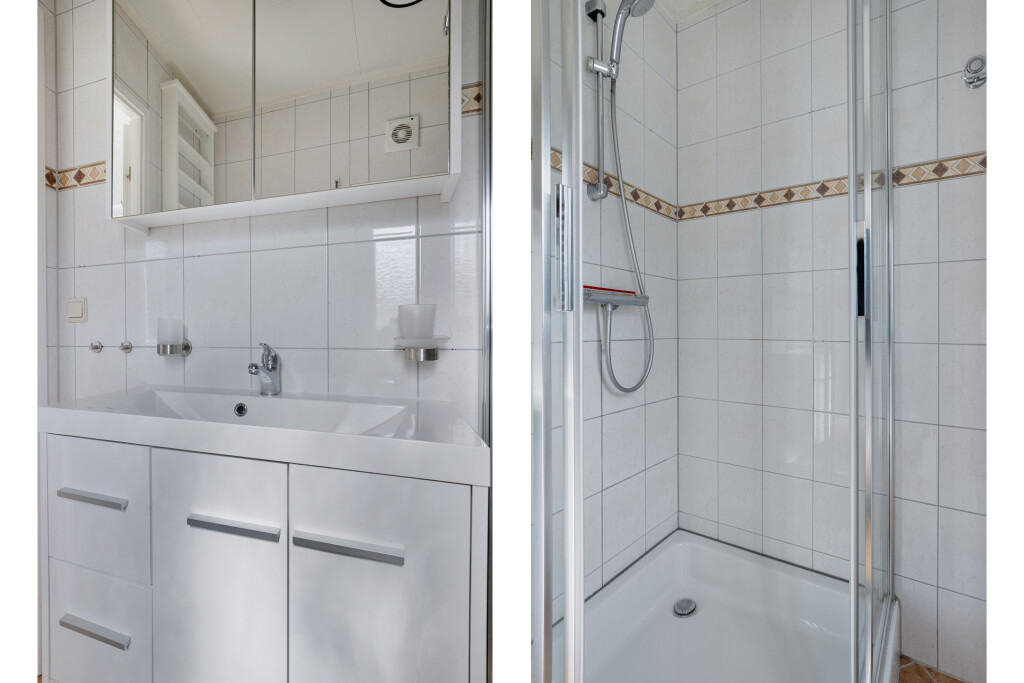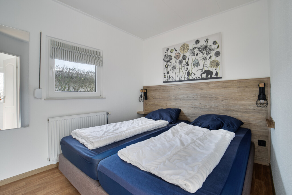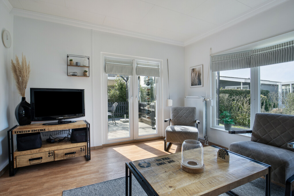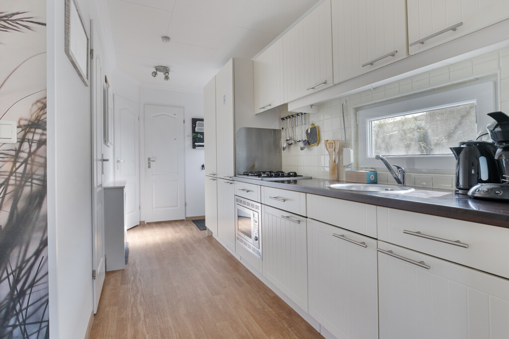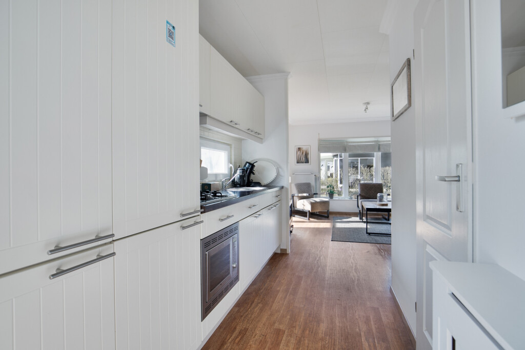Bij binnenkomst in het chalet betreedt u de hal die toegang biedt tot alle vertrekken. De ruime woonkamer met openslaande tuindeuren en de open keuken. De open keuken is uitgerust met inbouwapparatuur, waaronder een 4-pits gaskookplaat, afzuigkap, combi-oven, koelkast en een diepvries. Daarnaast beschikt het chalet over twee comfortabele slaapkamers en een nette badkamer met douche, wastafel en toilet.