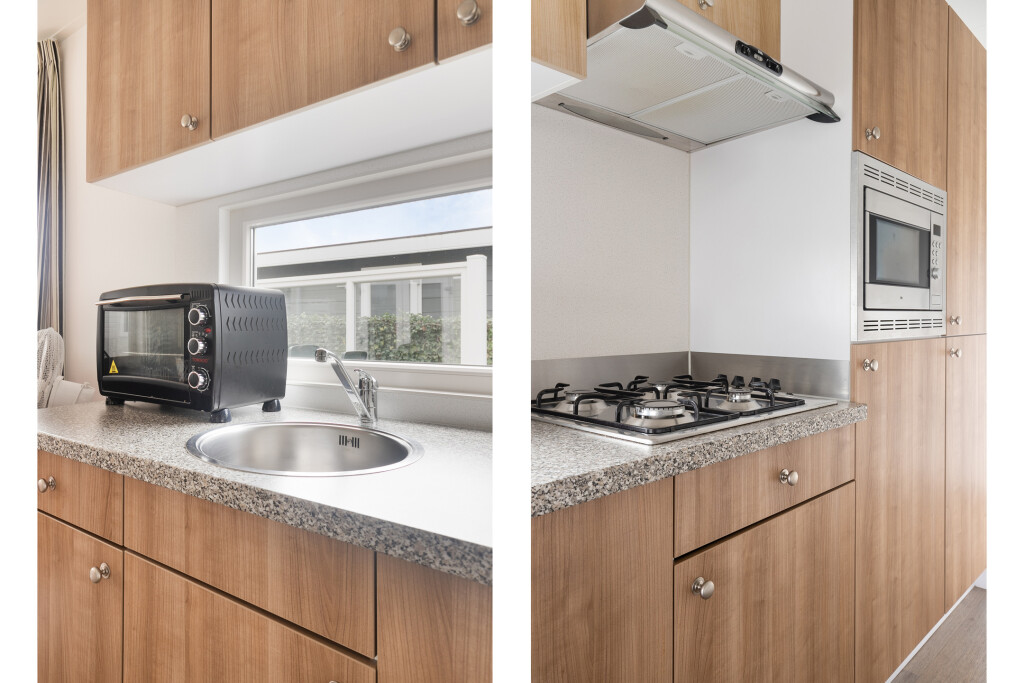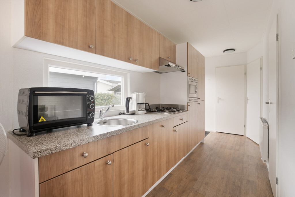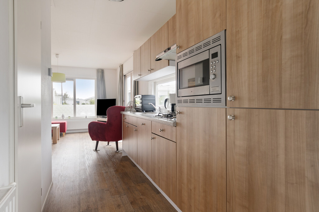 Entree in de hal met toegang tot alle vertrekken. Nette open inbouwkeuken voorzien van inbouwapparatuur zoals een 4-pitsgaskookplaat, afzuigkap, koelkast, magnetron en een vaatwasser. Aansluitend bevindt zicht de woonkamer met openslaande tuindeuren naar het terras. Verder beschikt het chalet nog over twee slaapkamers waarvan 1 met vaste kastruimte en de badkamer die is voorzien van een douche, wastafel en toilet.