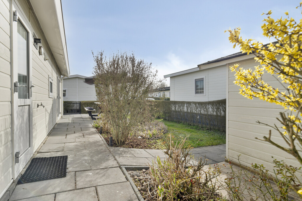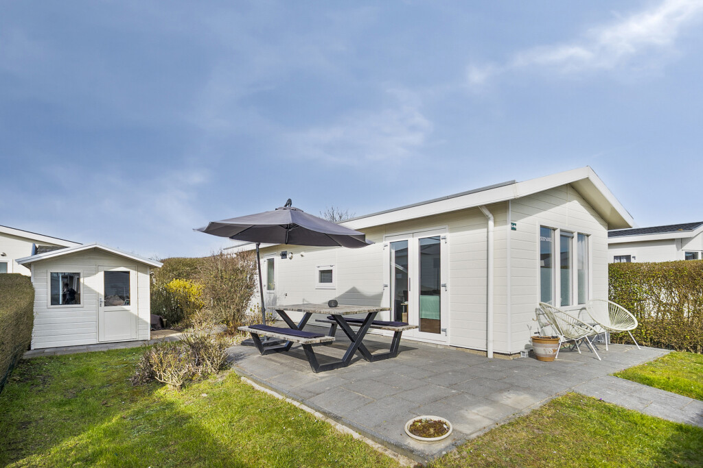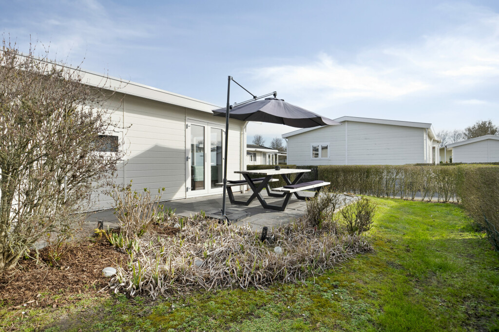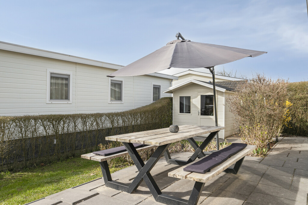 De zonnige tuin, gelegen op het zuiden, biedt op het terras voldoende ruimte voor een gezellige zit- en/of eethoek. De gezellige zit- en/of eethoek wordt gezellig gecreëerd door de picknicktafel die is geplaatst in 2024. Verder beschikt het chalet over een tuinhuis, voor extra opslagruimte.