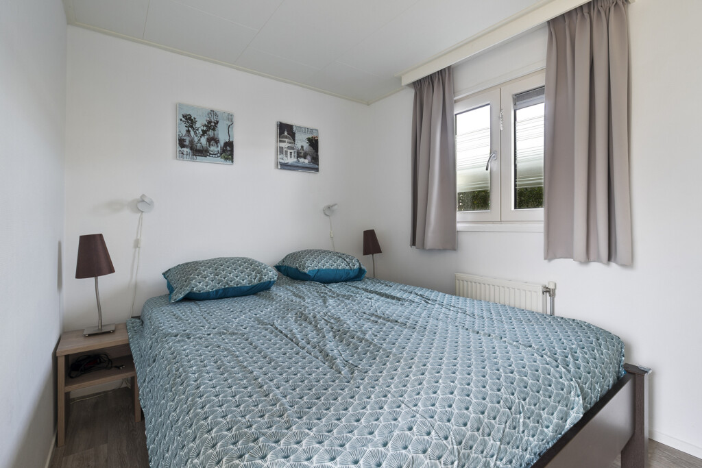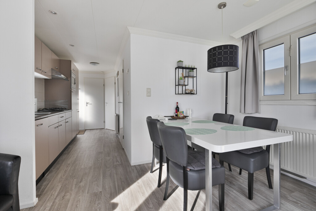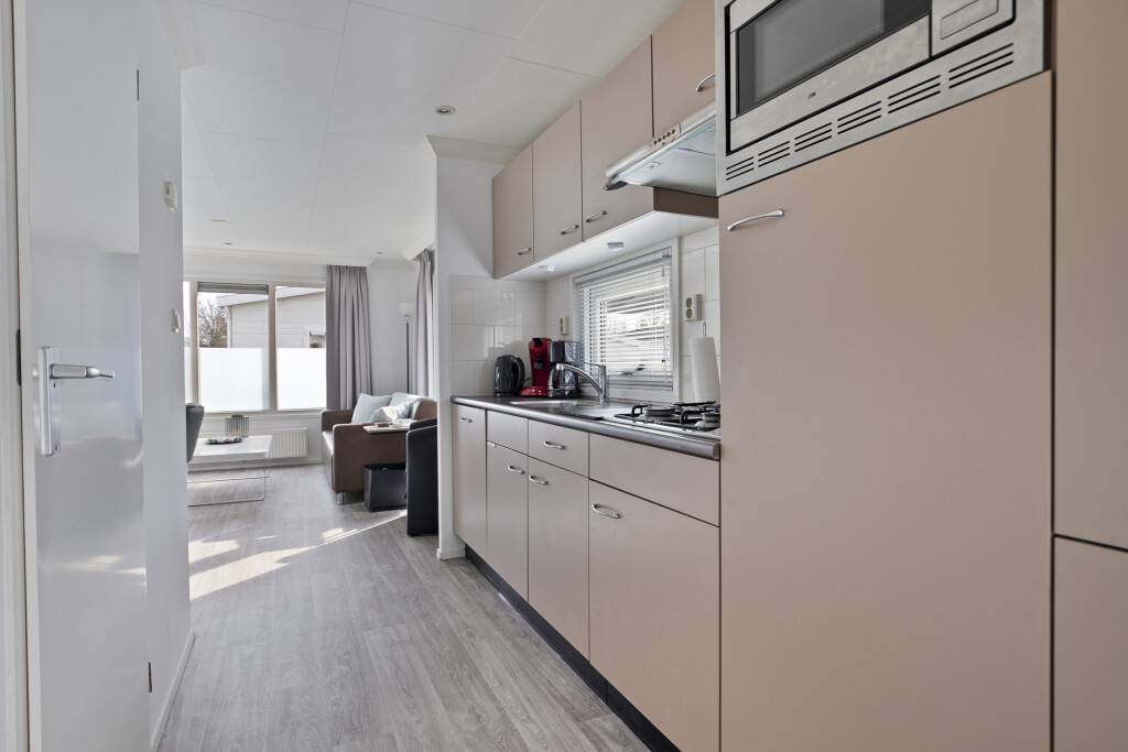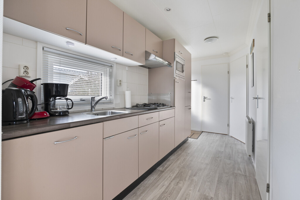 Entree in de hal met toegang tot de badkamer, uitgerust met een douchecabine (2023), wastafelmeubel en toilet. Vanuit de hal bereikt u de ruime woonkamer met openslaande deuren die toegang bieden tot de tuin met terras. De open inbouwkeuken is voorzien van een 4-pits gaskookplaat, afzuigkap, combi-oven, koelkast met vriesvak en een vaatwasser. Het chalet beschikt daarnaast over twee slaapkamers, beide met vaste kastruimte.