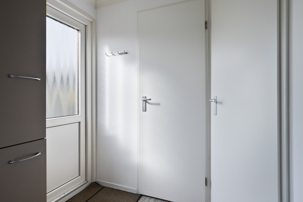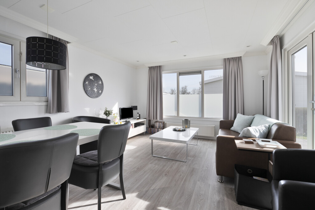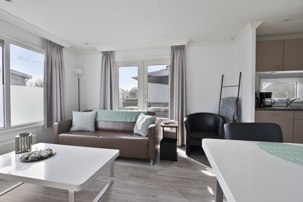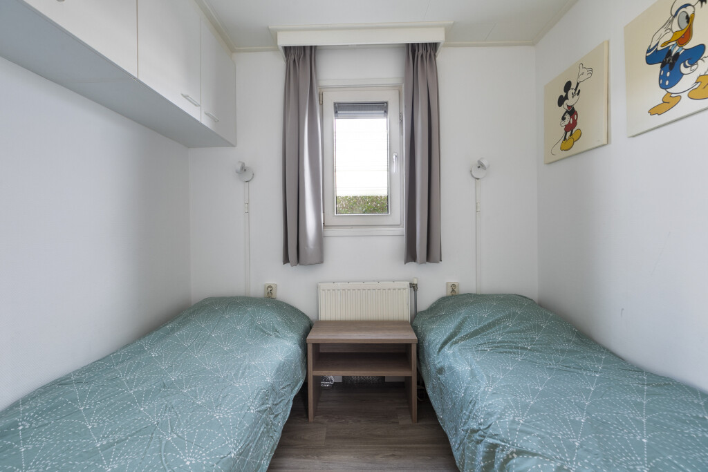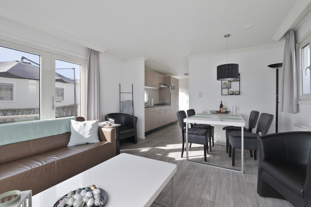 Entree in de hal met toegang tot de badkamer, uitgerust met een douchecabine (2023), wastafelmeubel en toilet. Vanuit de hal bereikt u de ruime woonkamer met openslaande deuren die toegang bieden tot de tuin met terras. De open inbouwkeuken is voorzien van een 4-pits gaskookplaat, afzuigkap, combi-oven, koelkast met vriesvak en een vaatwasser. Het chalet beschikt daarnaast over twee slaapkamers, beide met vaste kastruimte.